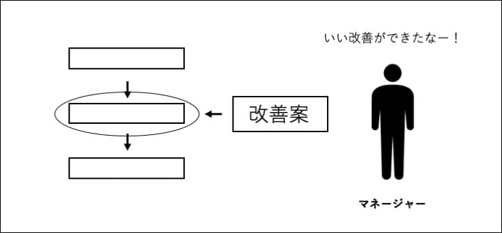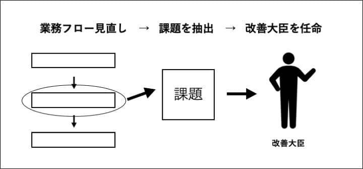 まずは、マネージャーが主体となり業務プロセスでの課題を抽出。その課題の改善案の作成をする「改善大臣」に、特定のメンバー1人を任命します。