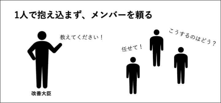 改善大臣には、改善するフローで一番成績(スキル)が低い人を任命しましょう。なぜなら、できないことが多いからこそ、課題も多く抱えており、最も改善に対しての意識も高いからです。