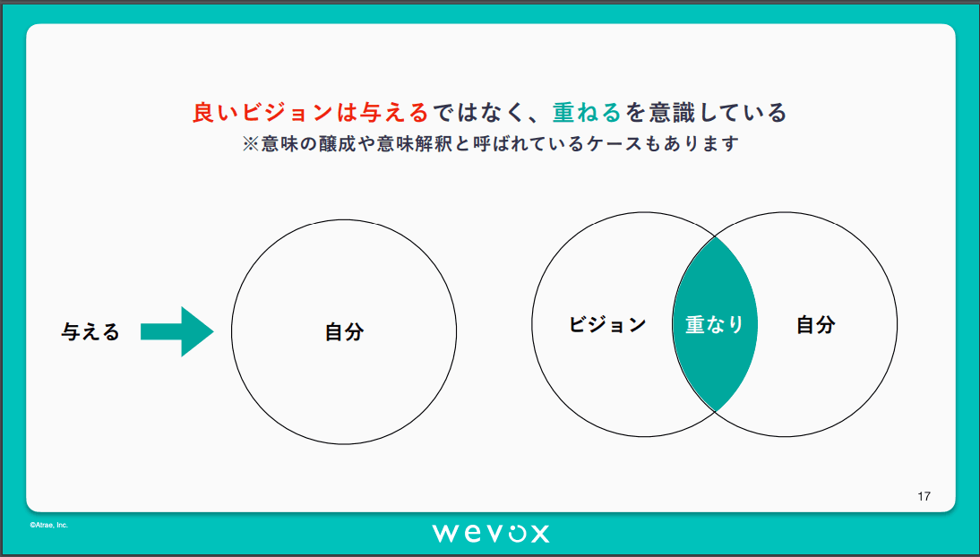 中村:私は最初のひと月で26コマ受講したので、この中ではもっとも受けたクラスは多かったと思います。その中で一番衝撃を受けたのが、「自分のビジョン」「チームのビジョン」「会社のビジョン」の重なりをいかに見つけていくかという話で、それがエンゲージメントの説明で一番しっくりきました。
