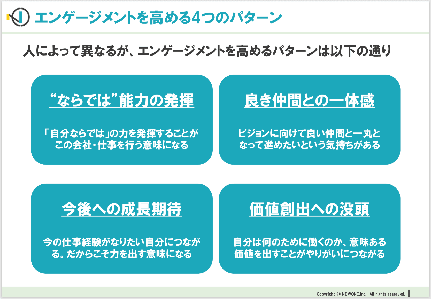 そうですね、仕事においては必ずしも楽しめる仕事ばかりとは限りません。そこで、この図を見てください。これは、エンゲージメントが向上する4つのポイントについてまとめたものです。