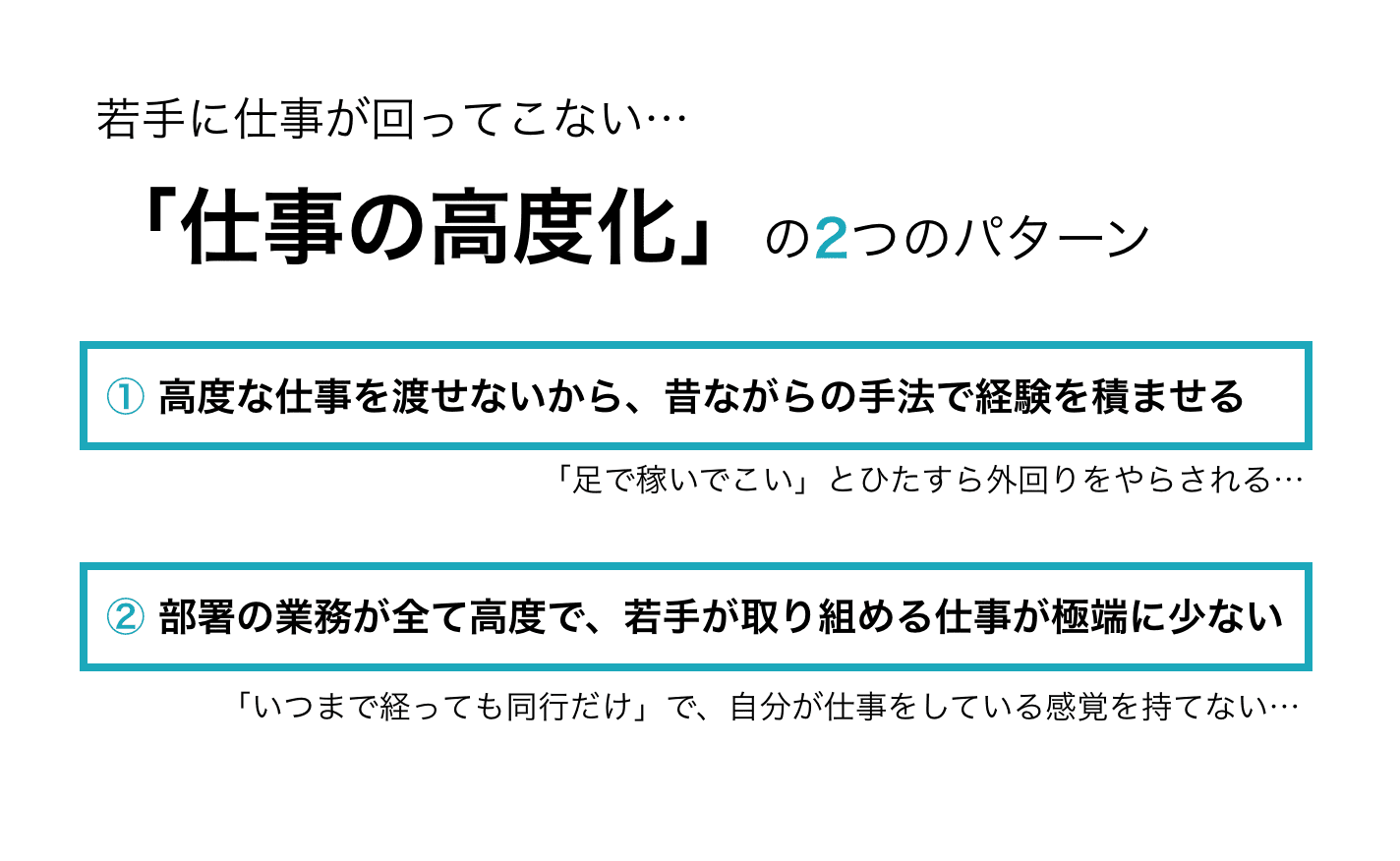 仕事が高度化することによる弊害には2つの種類があり、1つは「高度な仕事を渡せないから、昔ながらの手法で経験を積ませる」パターン。営業職だったら、「足で稼いでこい」とひたすら外回りをやらされてエンゲージメントが下がるパターンですね。このパターンは比較的昔からもあったかと思います。 もう1つのパターンは最近出てきているもので、「部署の業務が全て高度で、若手が取り組める仕事が極端に少ない」というものです。だから、「いつまで経っても同行だけ」という事態に陥り、自分が仕事をしている感覚、貢献している感覚が持てないのです。企画職などに多いパターンですね。他に、特に大企業だと、コンプライアンス上若手にはお願いできない仕事も年々増えています。