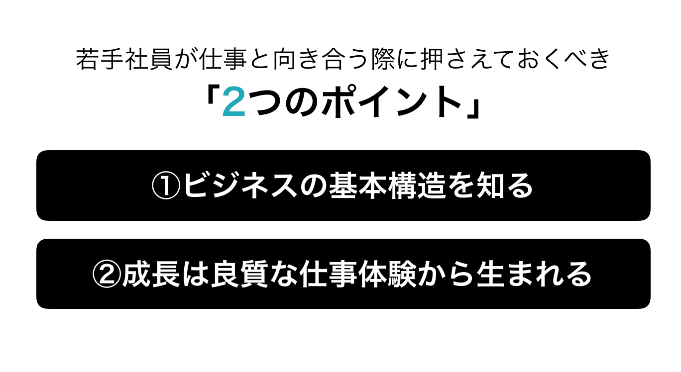 先程のリアリティショックは、まさにこのギャップに悩んでいる人ですよね。では、日常的な仕事とどう向き合えばいいのか。ここで大事なのが、「ビジネスの基本構造を知る」「成長は良質な仕事体験から生まれる」の2点です。