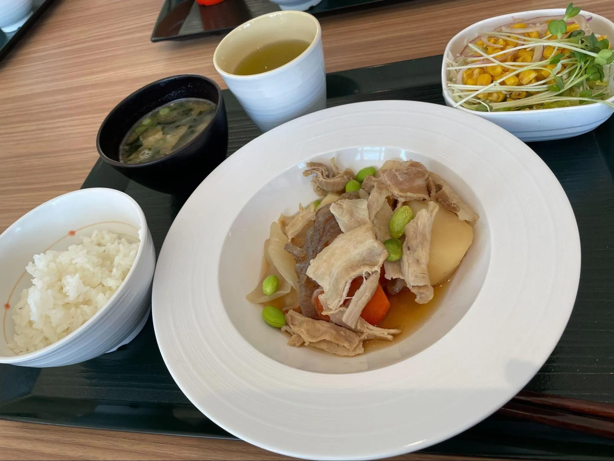 さらに嬉しいことに、工場敷地内の社員食堂にもお招きいただき、同社の製造するトレハロースも使用された定食をいただきました。日々の業務を支える“食”にも、誇りと工夫が詰まっていることを実感しました。日替わりの定食があり、この日いただいたのは豚じゃが定食でした。