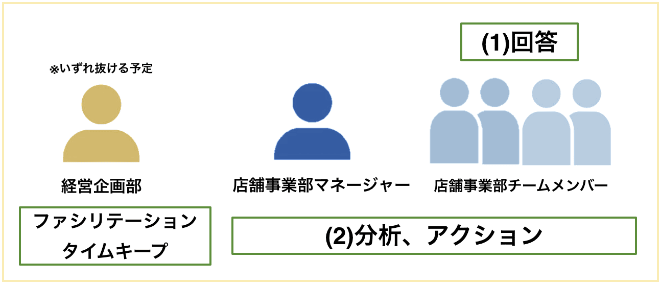 全社導入をどのような形で進めるか。色々と考えた結果、「一度全社員で一斉にKPTワークショップを行い、その後継続を希望するチームに本導入する」という形をとることにしました。つまり、店舗事業部の方法を全社員お試しで実施し、本導入は希望制にすることにしたのです。明暗を分ける「お試し」の場は、1カ月後にある社員総会で決まりました。