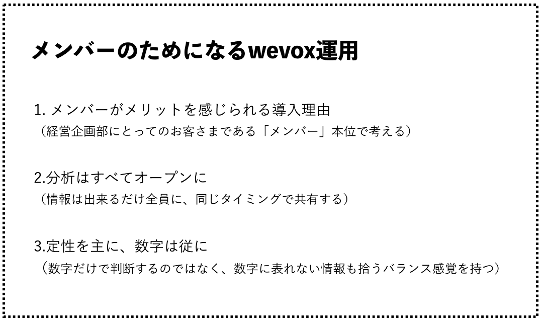 そもそもwevoxの導入を考えたのは「経営企画部が熱量のある組織を作るために、現状を把握し対策を打てるようにするため」でした。しかしこの理由は、よく考えると経営企画部にとってのメリットしか説明しておらず、メンバーにとってのメリットが見えません。それが結果としてwevoxに対する関心の薄さや「経営企画部は何をしてくれるのか」という人まかせの反応に繋がってしまったのではないかと考えました。