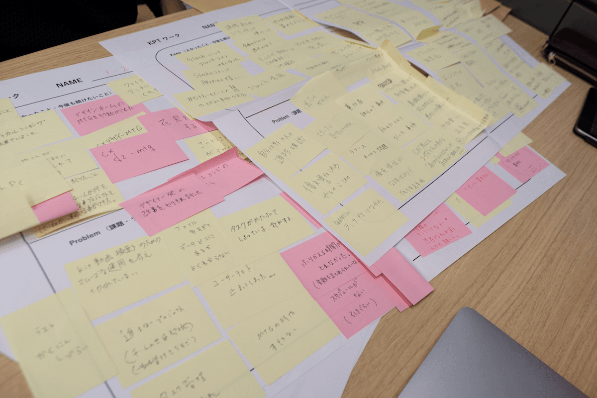 KPTとは「Keep、Problem、Try」の略で、その名の通り、続けていきたいこと(Keep)、課題だと感じていること(Problem)、やってみること(Try)をそれぞれのメンバーが自由に付箋に書き、共有していくことで進んでいきます。KPTで出し合う定性的な意見とwevoxの定量的なデータを複合的に参考にしながら、自分たちのチームのいいところ、直した方がいいところを考え、最終的に1カ月間やってみる具体的な改善アクションを考えてワークショップは終わります。“分析をオープン”にし、“定性を主に、定量を従に”するという点を意識した運用フローです。