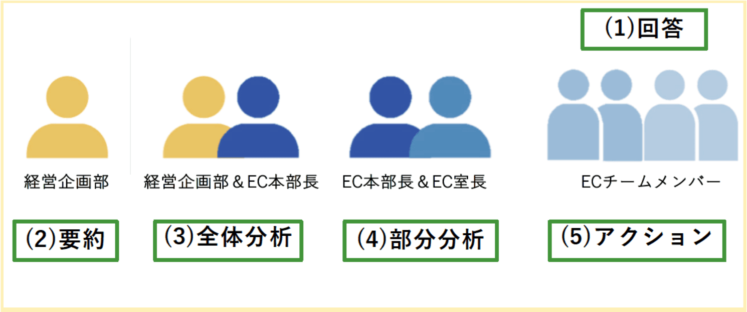 回答するメンバーありきの仕組みにもかかわらず、トライアルの運用フローでは、私やEC本部長、各室長を経ることで、メンバーに対してダイレクトにフィードバックをすることが難しい体制になっていました。そのせいでメンバーは「サーベイで回答した結果」がどのような分析を経てフィードバックされているのかが把握しにくく、仕組み全体が不明瞭なブラックボックスのような印象を与えてしまっていました。