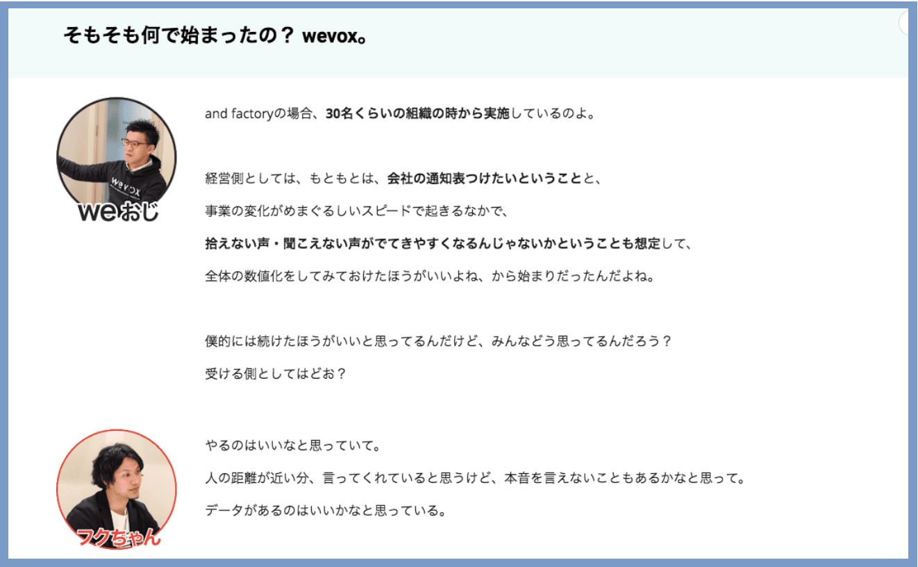 あくまで、人事担当役員としての視点からですがwevoxを活用することで「問題の先読み」が可能になったことが組織づくりの点ではかなり有益だと感じています。退職リスク、仕事へのパフォーマンスに繋がる不満、これらを症状が出る、あるいは悪化する前に対応できている。それによって、ハイパフォーマンスを発揮できる組織状態を維持でき、成長の連続に繋がっていると思います。