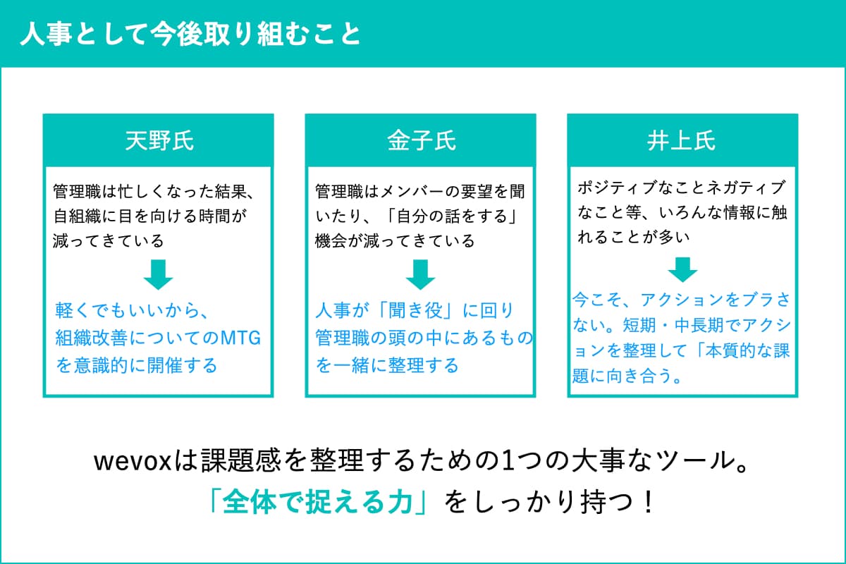 井上:はい。そのときに、wevoxは課題感を整理するための1つの大事なツールになり得ます。これを活用するのは前提として、それ以外の情報も含めて「全体で捉える力」をしっかり持って進めていきたいです。