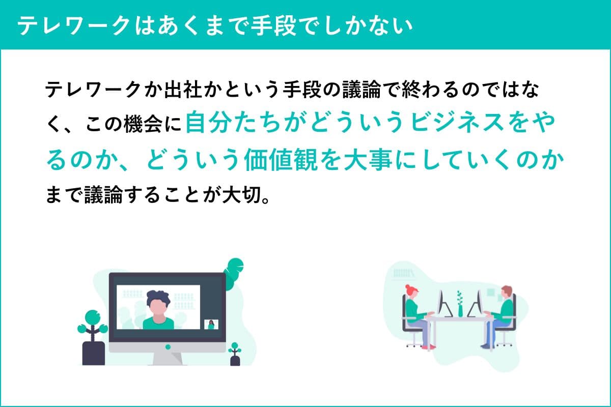 私自身、ここ数カ月の変化で思うことはたくさんありました。大きな気づきとしては「働き方は手段にすぎない」です。テレワークを継続するか、いつから出社するのか、全て手段です。コロナ禍の影響で、多様な議論が起きたことはいいことです。ただあくまでそれらの手段を駆使して、自分たちがどういうビジネスをやるのか、どういう価値観を大事にしていくのか、が大事です。
