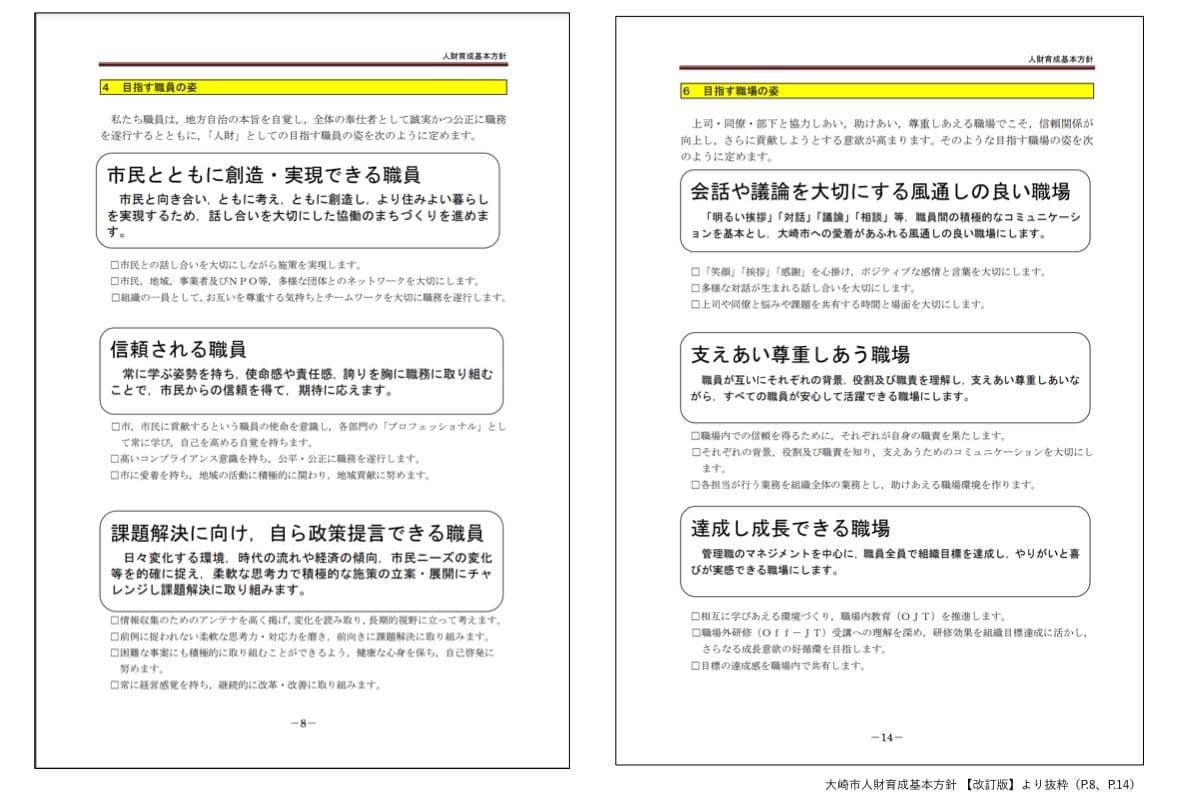 (坪谷)そうですね。合併直後の平成19年3月に、「宝の都(くに)・大崎 -ずっとおおさき・いつかはおおさき-」という総合計画に掲げる将来像を実現するために、「大崎市人材育成基本方針」を作成しました。