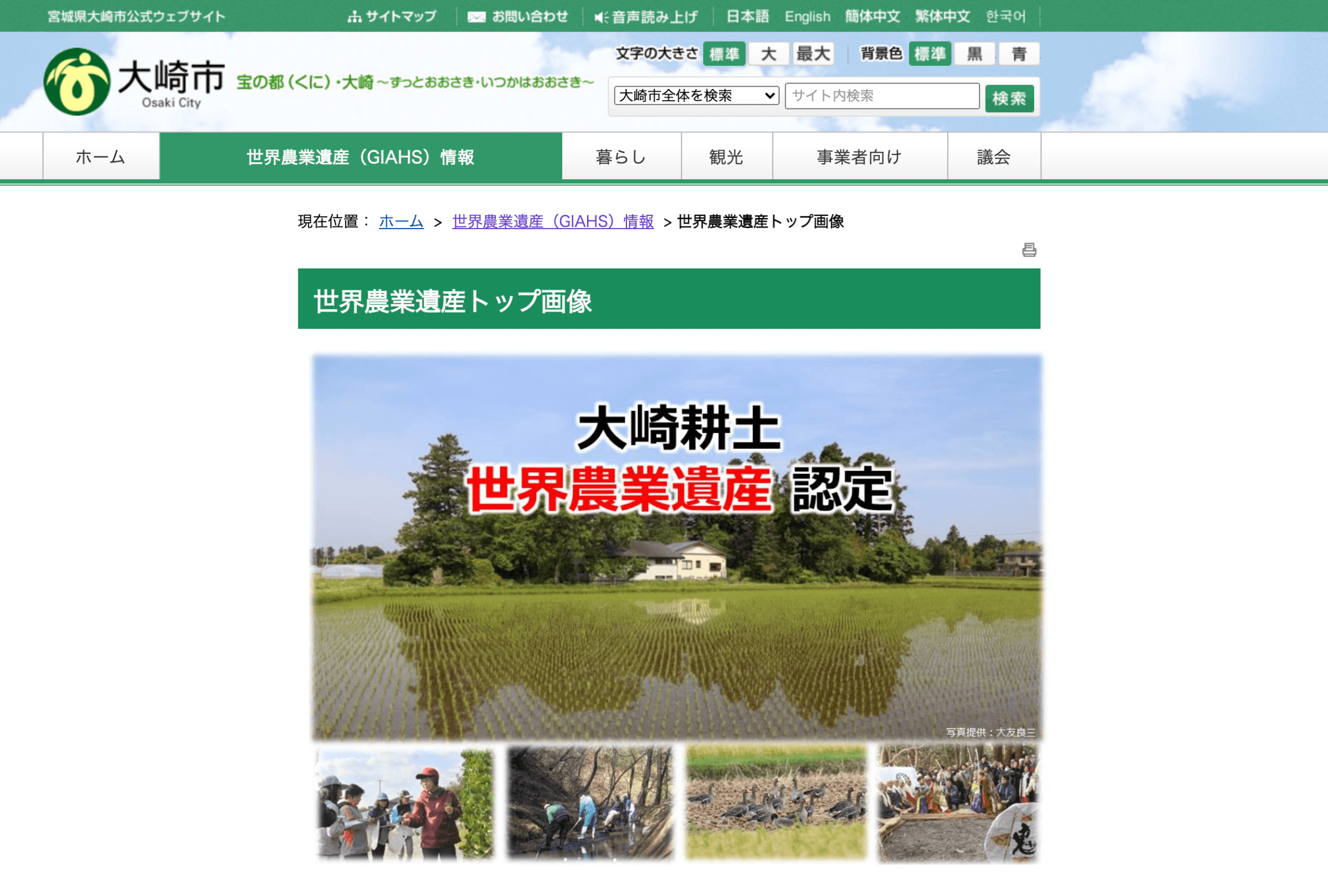 大崎市は平成18年3月31日に1市6町が合併し誕生しました。宮城県の北西部に位置し、東西に約80kmの長さを持つ宮城県で2番目に面積の大きな市です。また、広大で肥沃な平野「大崎耕土」を有する四季折々の食材と天然資源、地域文化の宝庫で、大崎地域の農業は世界農業遺産にも認定されています。人口は仙台市、石巻市に次いで県内で3番目に多く、県北の中心都市であります。