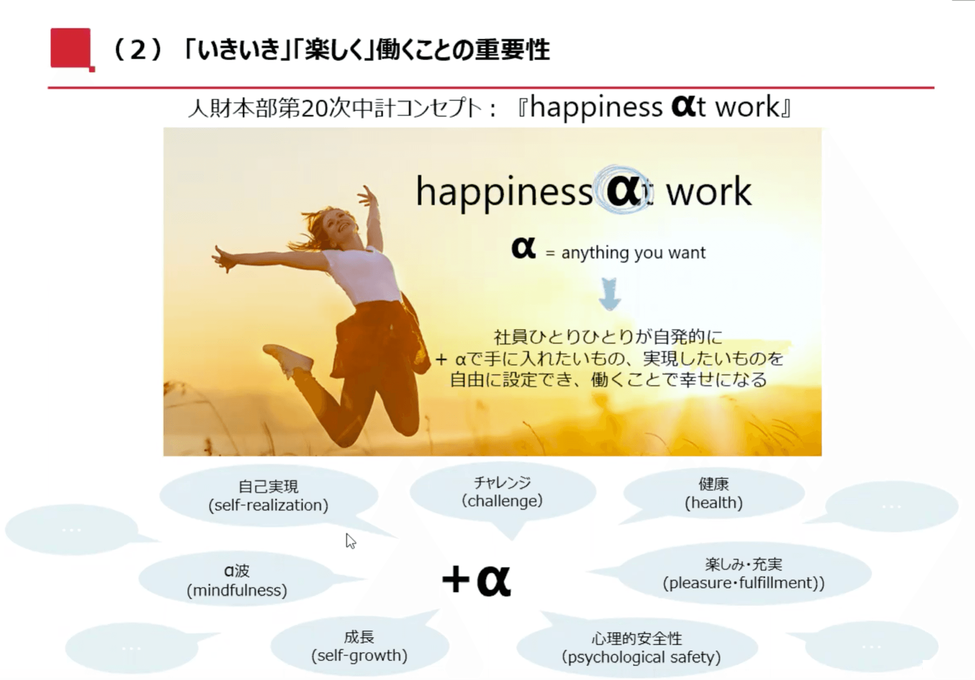 私が所属する人財本部では、中期経営計画のコンセプトとして「ハピネス@ワーク」というスローガンを掲げているのですが、この中の@が実は「α(アルファ)」になっており、社員一人ひとりが手に入れたいことを自発的にプラスアルファとして設定し、働く中でそれを実現することを通じて幸せになってもらいたい、というコンセプトです。