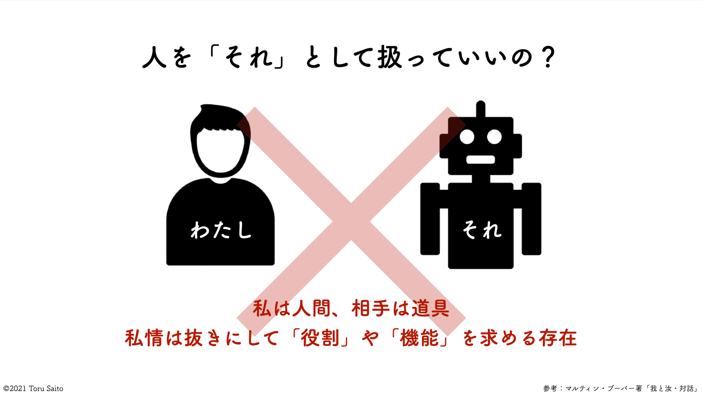 例えば、私は「私」なんだけれども他人のことは「それ」っていう感じで見ることって、ビジネスではとても多いですよね。私情は抜きにして、人には役割とか機能だけを求める動きがビジネスでは推奨されていたんです。それはなぜかというと、今までは統制するような組織が効率的だったからです。統制しやすい組織にするためい、そうしたカルチャーにしていたわけですね。
