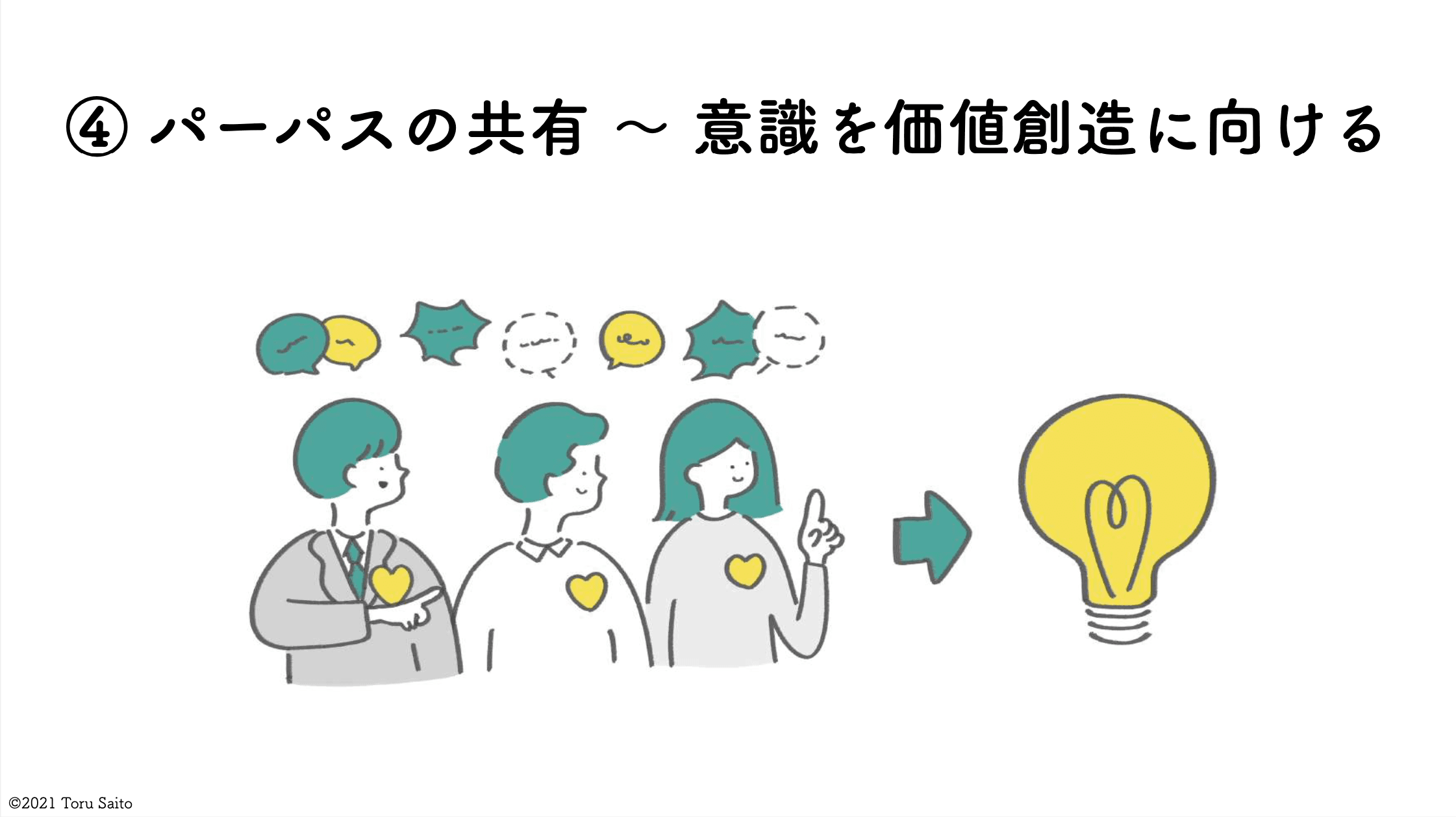 外のパーパスを重視する=価値を重視するということ。パーパスというのは「自分達が社会に対して作り出す価値」のことなので、内側じゃなくて外側に注目しなければいけません。これについては経営者も発言の仕方に少し注意する必要がありますし、メンバーの方の「自分たちは何のためにこの会議やっているのか」や「何のために今のチームがあるのか」という意識も必要です。意識を内から外に、人間関係から価値創造に向ける必要があるんです。