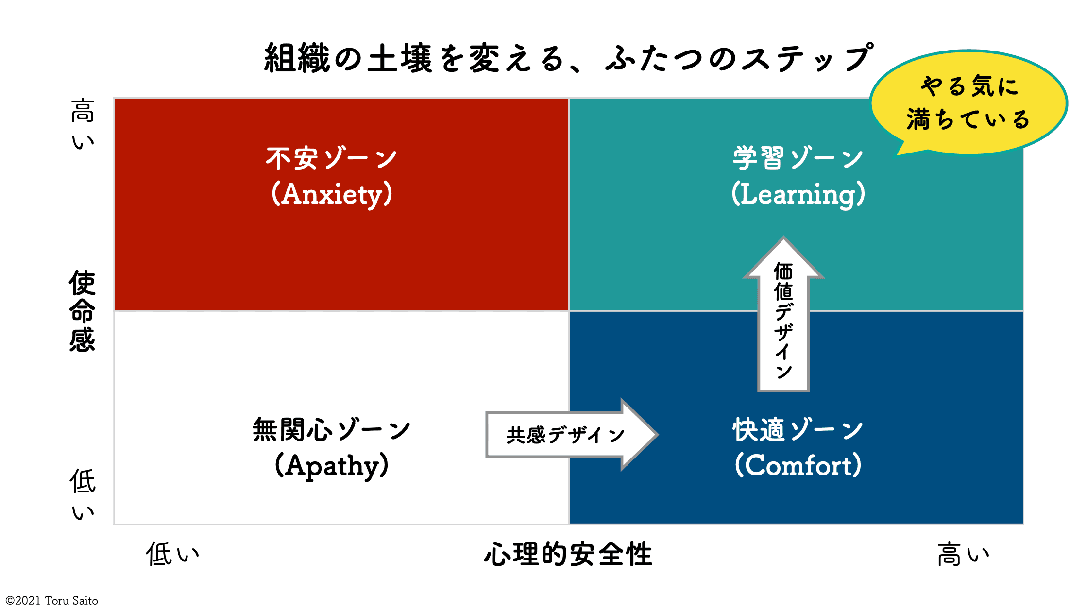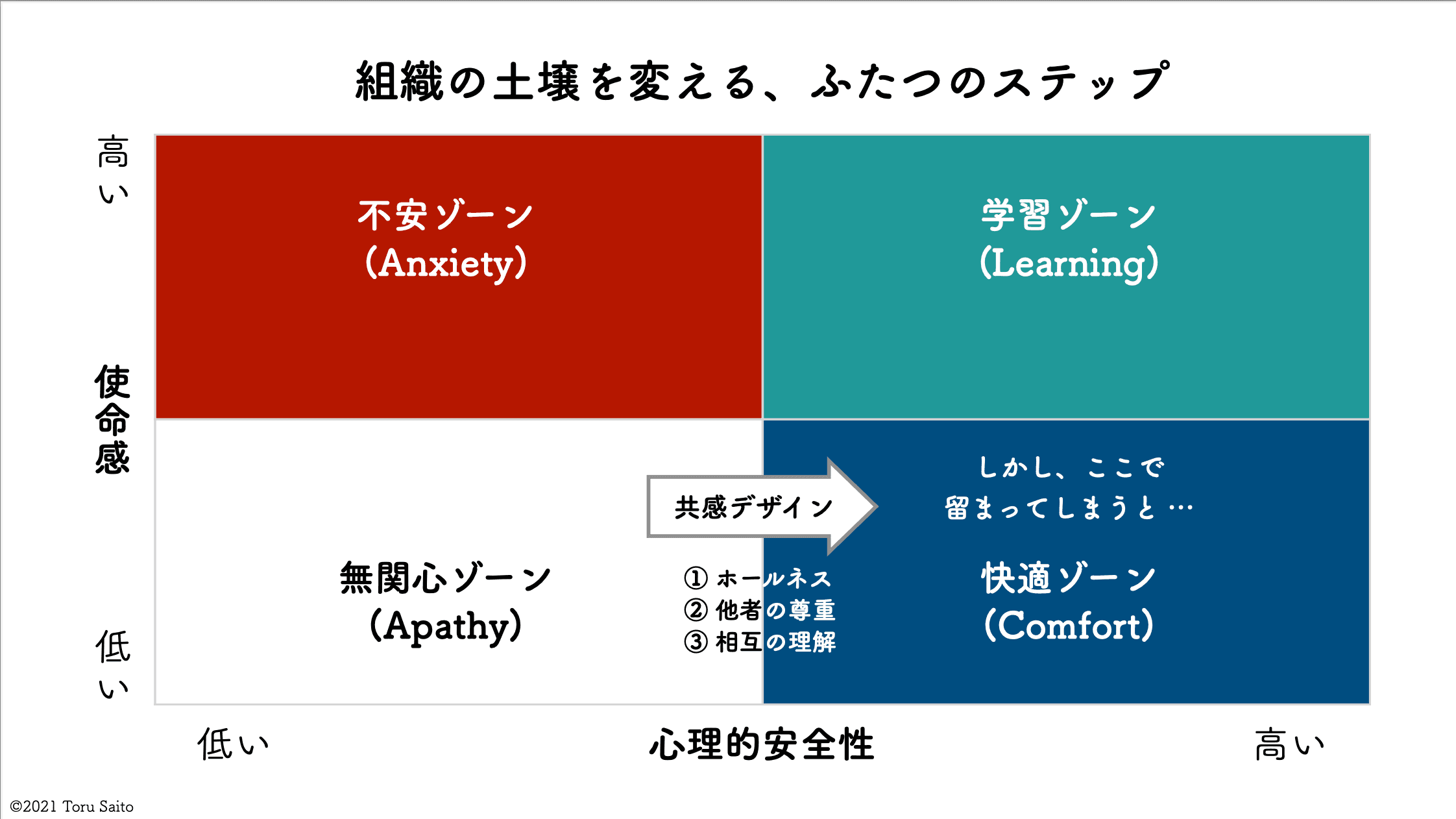 ここまで話したのは、「だから僕たちは、組織を変えていける」の中で書いている、組織の土壌を良くして無関心ゾーンを学習ゾーンに、やる気に満ちたやさしい組織にするための2つのステップのうち、1つ目のステップです。職場を心理的に安全な場にすることによって、ホールネスや他者の尊重、相互の理解でコンフォートゾーンに入り、チームがいい関係性になります。