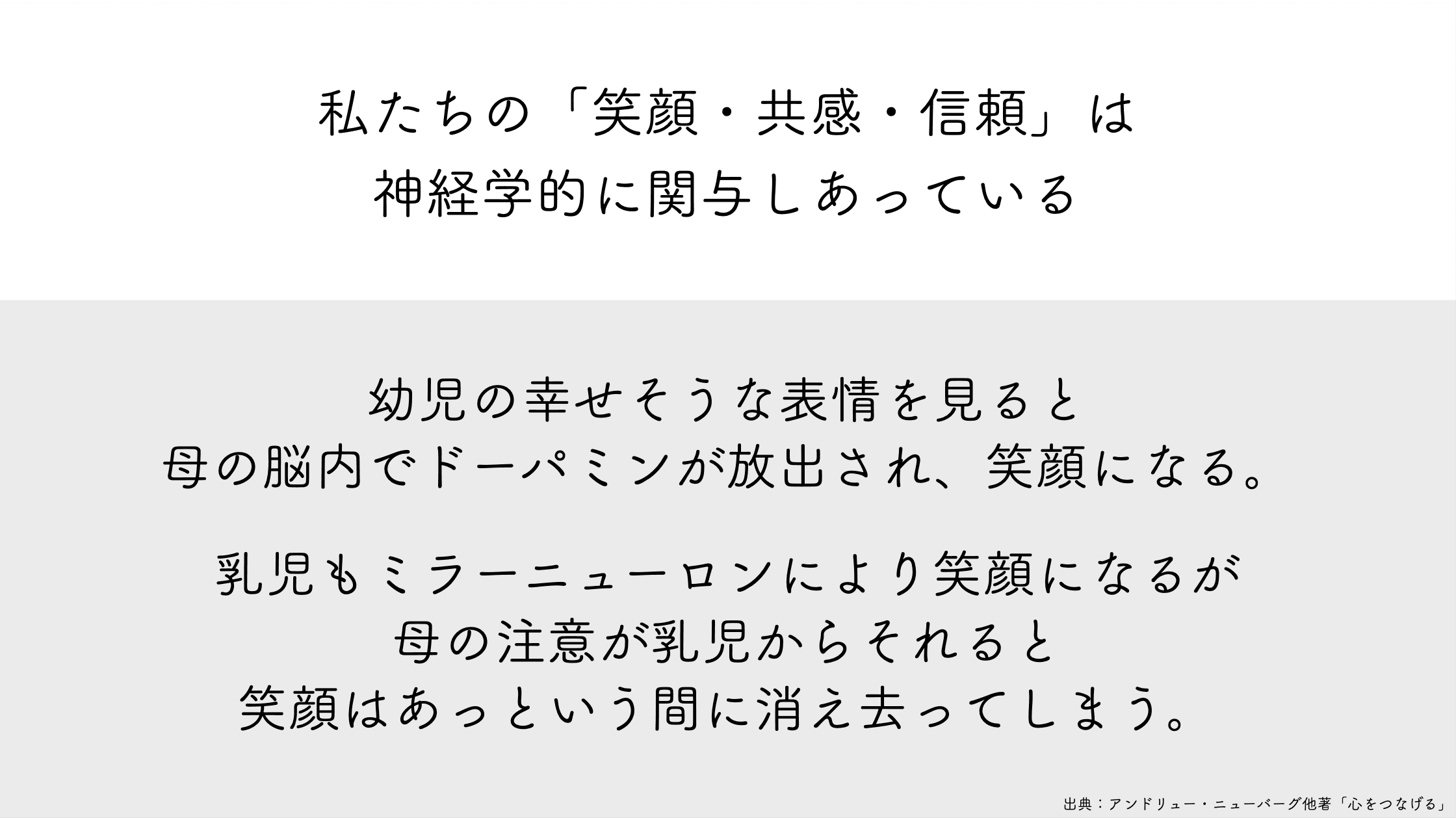 そこでポイントとなるのが、ミラーニューロンです。これは人間や猿が持っている、目の前にいる人の行動を見て脳内に鏡のように映し出す神経細胞のことで、目の前の人の表情などをコピーするような機能があります。つまり、笑顔や共感、信頼というのは表情に出ていて、神経学的には関与し合っているんです。例えば、幼児の幸せそうな顔を見たお母さんの脳内でドーパミンが出て笑顔になると、幼児もそれによって笑顔になります。だけど、お母さんの注意がそれると消えてしまう。