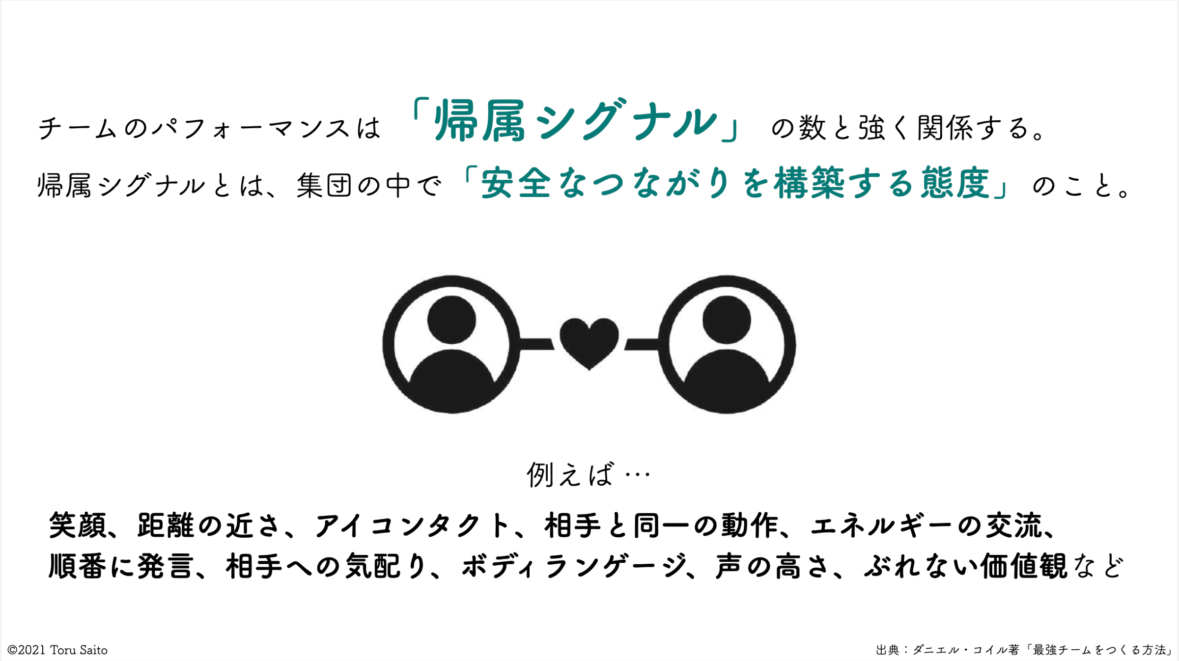 「ここは安全な場所だから怖がらずに自分の意見を言ってもいいんだよ、みんなの意見を聞きたいと思っているんだ」ということを、ボディランゲージあるいは小さなメッセージで送り続けているということが分かったんです。ジョナサンはリーダーではなく、指示も鼓舞もしていないのにこのような結果が生まれました。ジョナサンのこの行動について、アメリカのMITのメディアラボがソーシャル物理学という研究の中で、ある発見をしました。彼らはジョナサンのような行動を「帰属シグナル」、つまり「安全な繋がりを構築する態度」と名付けました。帰属シグナルがたくさん出ているチーム=生産性が高いということです。