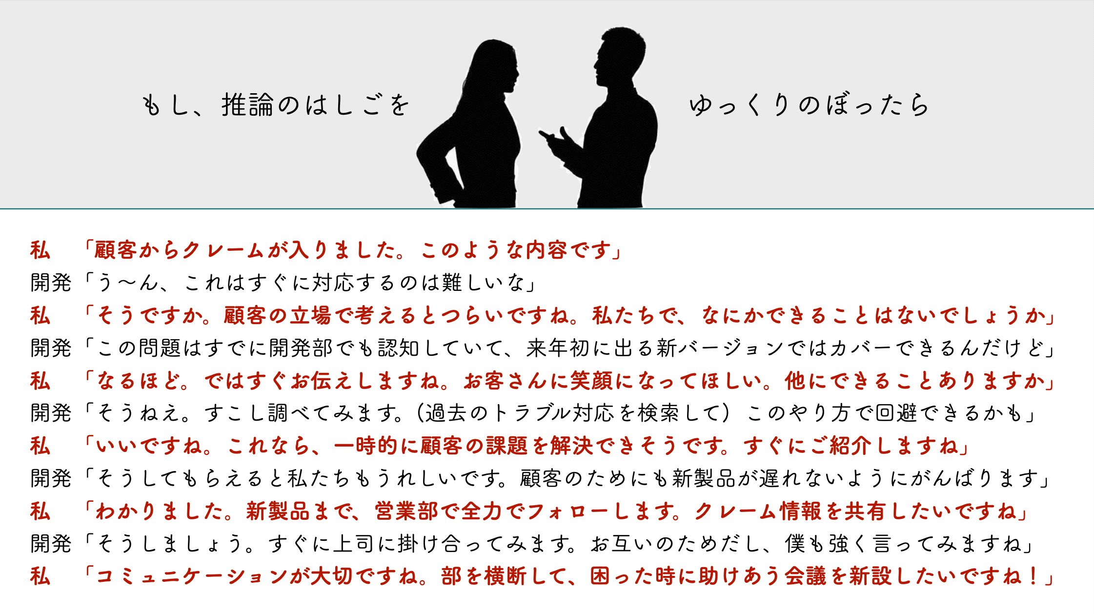 そうすると開発部も「この問題は開発部でも認知していて、でも次のバージョンでカバーできるんですよね」と本音が出てきます。それにより営業部も「ではすぐそれを伝えますね。でもお客さんには笑顔になってほしいです。何か他にできることはないですか」と歩み寄れますし、開発部も「では少し調べてみますね」と言って過去の対応を検索し、回避策を提供できるかもしれません。このように、お互いの本音が出てくるようになるわけですね。ただはしごを持つだけではなく、建設的に第三案を競創するためには、推論のはしごをゆっくり登ることが大切です。