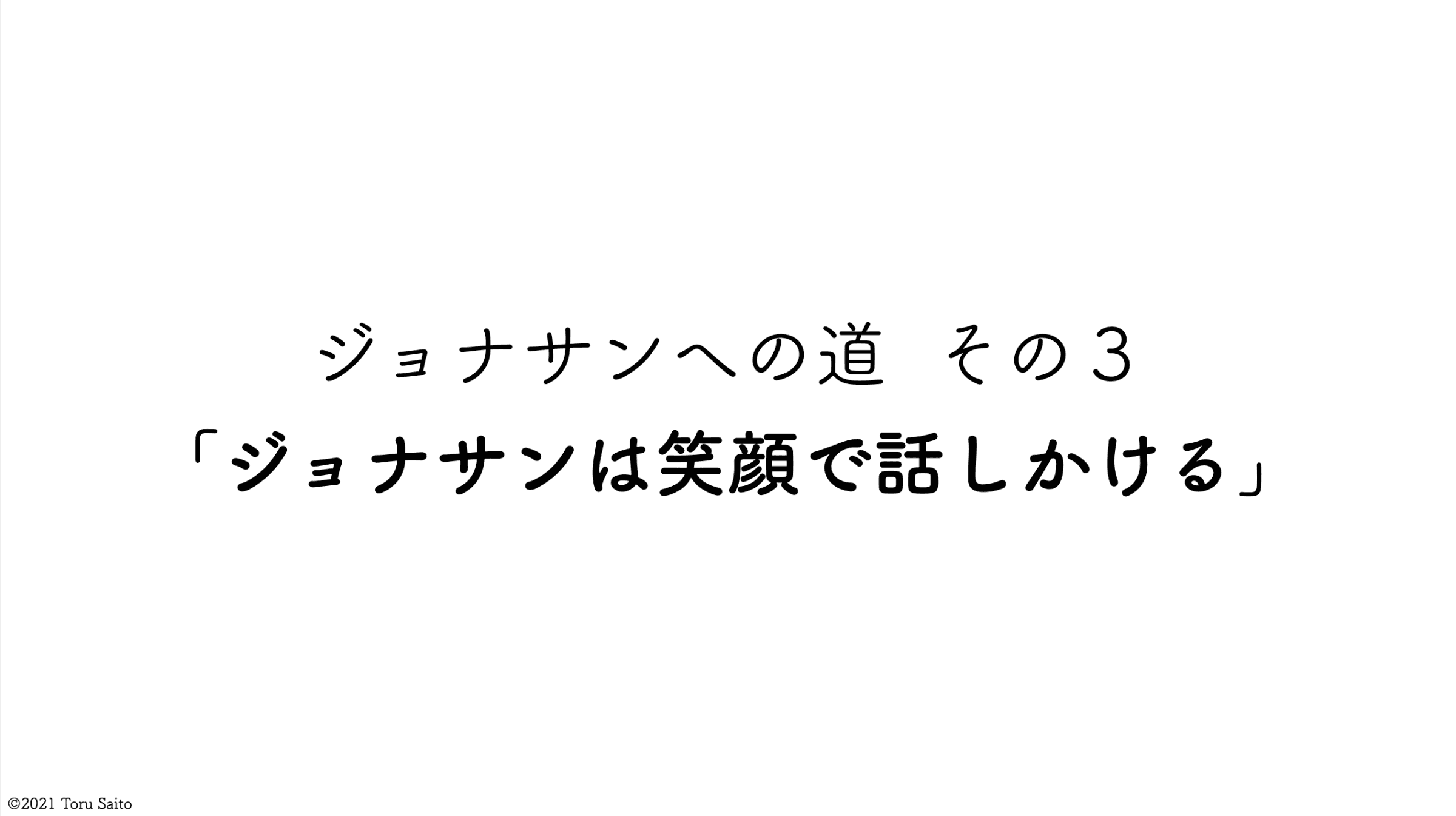 3つ目は「ジョナサンは笑顔で話しかける」です。先程の1と2のホールネスと他者の尊重というのは自分の中のマインドセットの問題ですが、ここからはコミュニケーションの話になります。