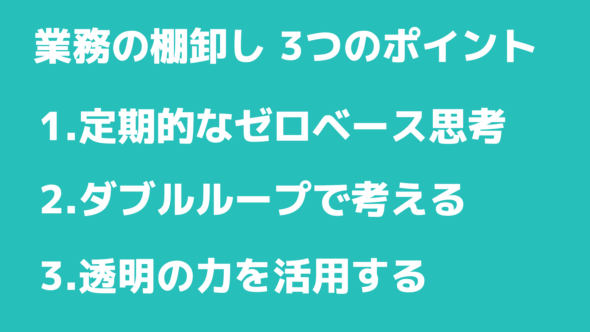 1つ目は、定期的にゼロベース思考になること。この棚卸しは1年に一回ぐらいのペースで行うといいです。本当にゼロベースで、自分の業務を見直して、いらないものは捨てていく。断捨離のようなものですね。