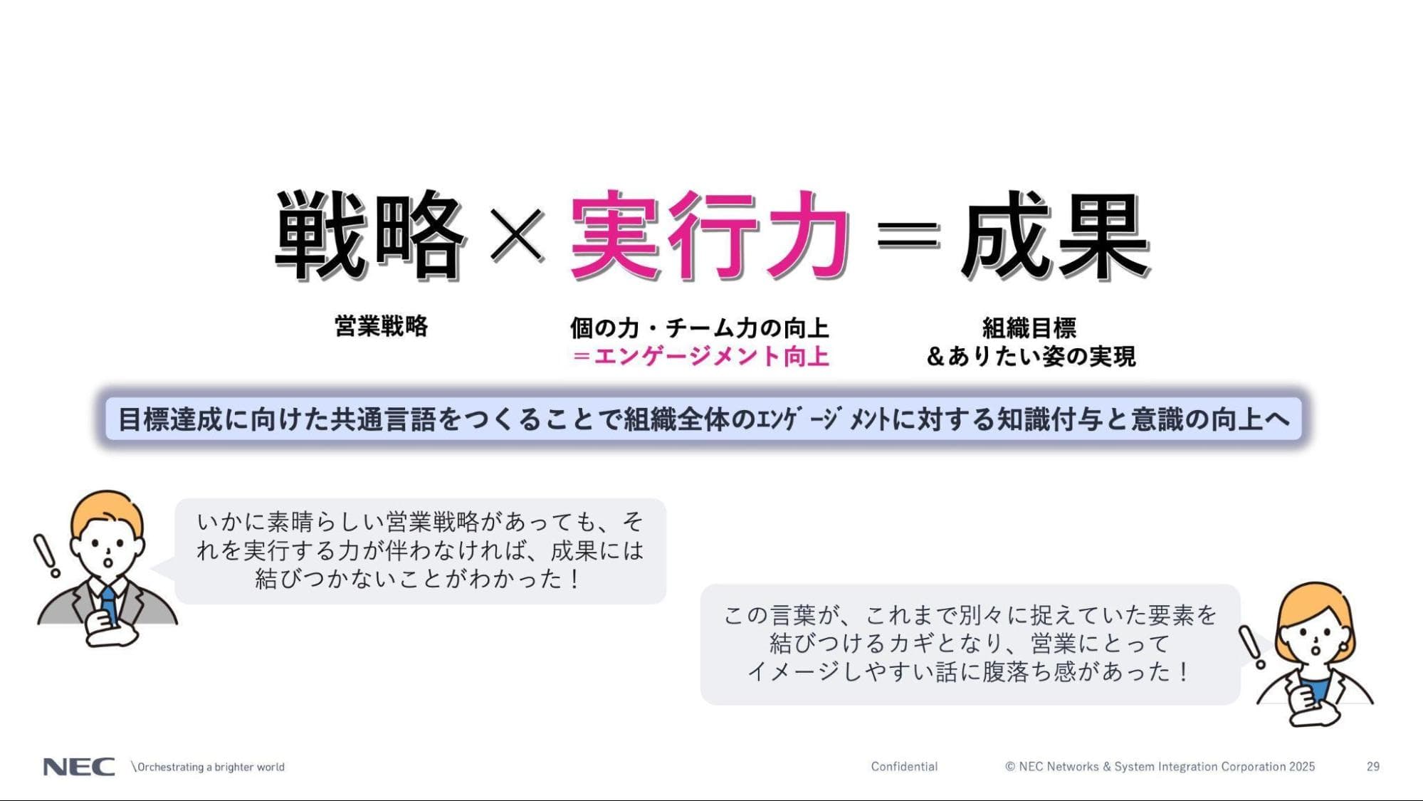 江藤: 「戦略×実行力=成果」という、共通言語をつくることで、営業戦略とエンゲージメントが別のものではないと認識していただくことができ、腹落ちと同時に組織全体のエンゲージメントに対する知識付与と意識の向上へつながりました。