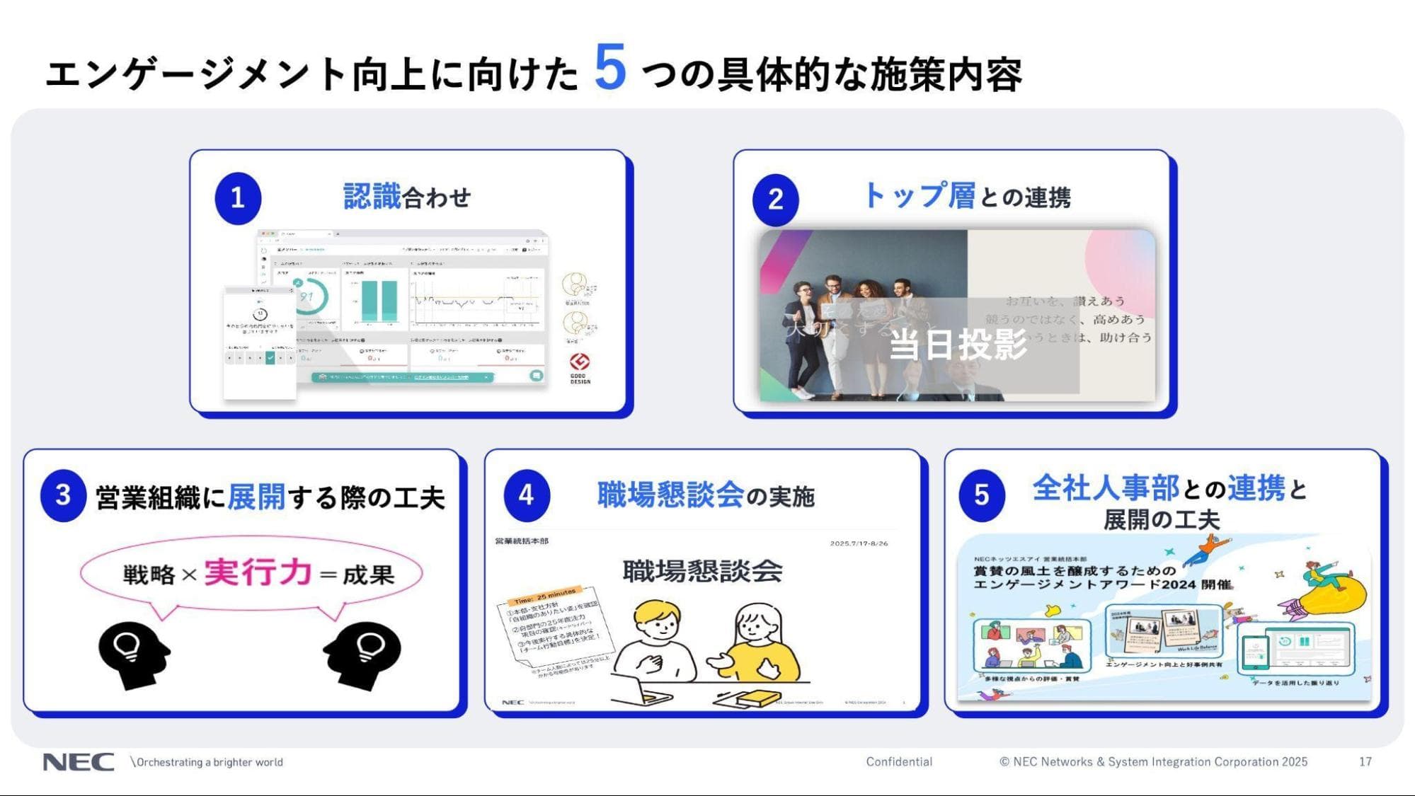 江藤: ここからは、エンゲージメント向上に向けて取り組んだ、5つの具体的な施策についてお話しします。
