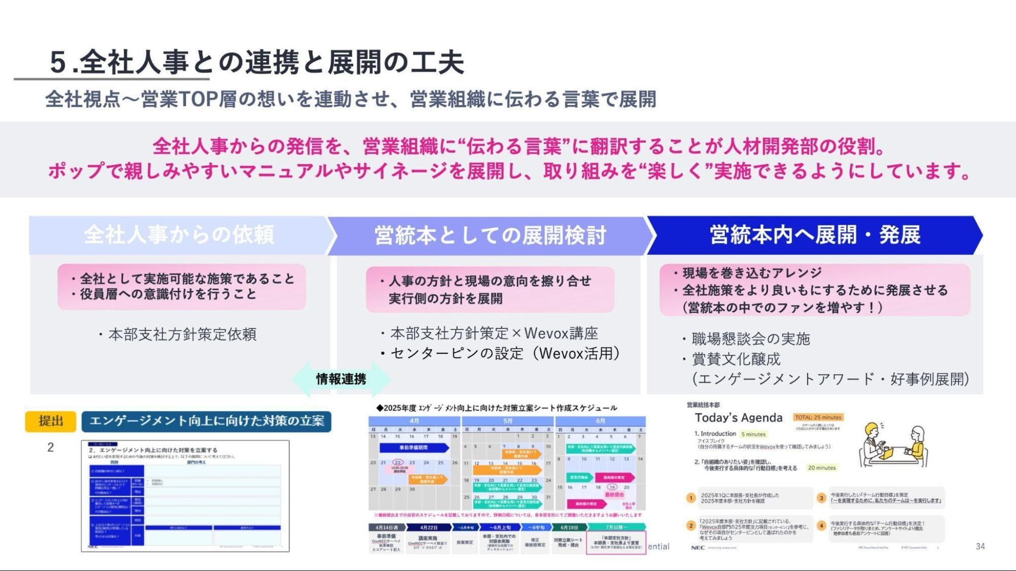 江藤: 最後の内容として、全社人事部との連携と展開の工夫についてお話しします。これまで営業組織として独自の取り組み内容をお話ししてきましたが、全社人事からの発信を、私たち営業統括本部としてどのように展開していくかがとても重要と考えています。