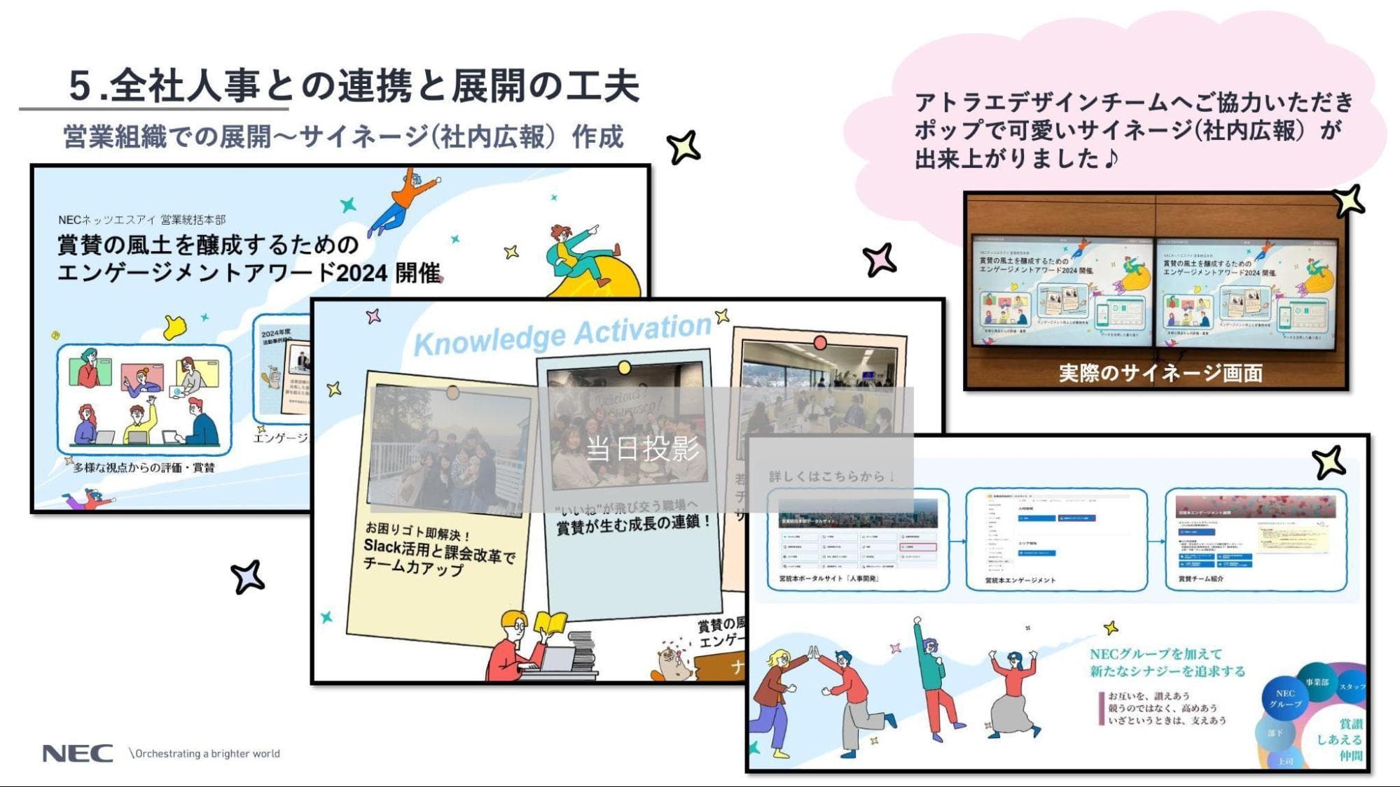 また、エンゲージメントアワードについては、全社で流れているサイネージ(電子看板)を活用し、情報発信も行っています。アワードで選出された賞賛部門の素晴らしい取り組みを宣伝し、本部のホームページ内でその詳細を紹介しています。サイネージに掲載するこちらの資料作成にあたっては、アトラエ様のお力をお借りして、とても素敵な作品を作っていただくことができました。こうして活動をきちんと可視化することで、他の部署にも良い影響が広がると考えています。