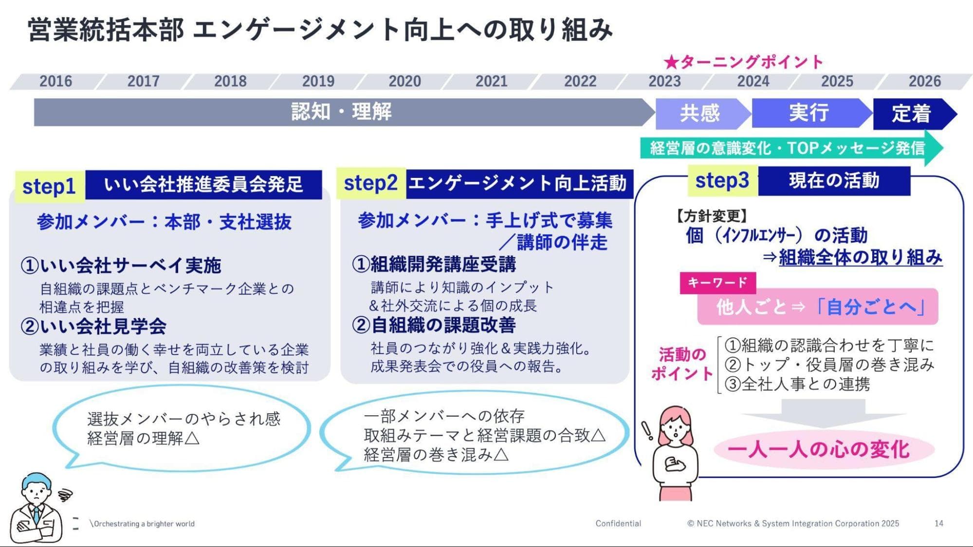 二つ目は、私たちの活動方針を「個人の取り組み」から「組織全体の活動」へと変更したことです。この変化により、営業統括本部の本部員たちがエンゲージメントを「他人ごと」から「自分ごと」として捉えるようになり、現在の活動へと発展しました。