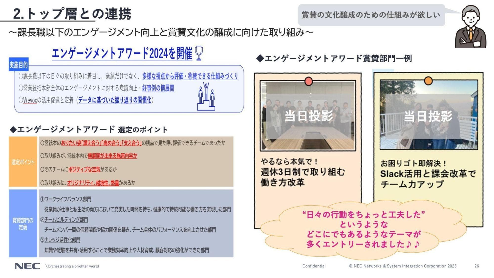 また、課長職のワークショップでは、世代間のギャップや業務負荷といった課題が多く出ましたが、その中でも「風通しの良さ」や「団結力」に誇りを感じているという意見も多くありました。そこで、数字で判断されがちな営業組織において、日々の取り組みを別の指標で評価・賞賛できる仕組みとして「エンゲージメントアワード」を昨年度開催しました。