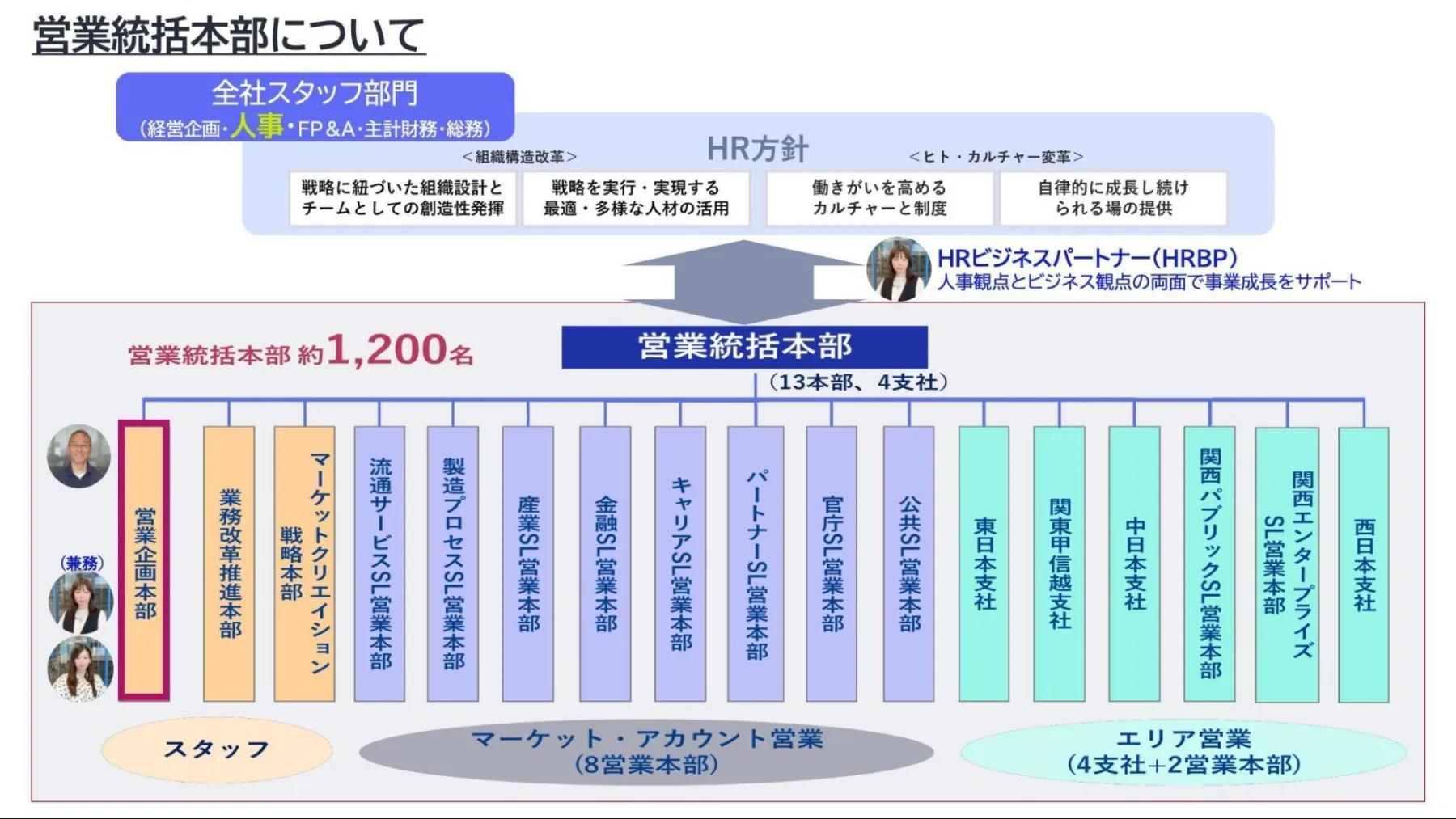 次に、私たちが所属する営業統括本部についてご説明します。営業統括本部は13本部4支社で構成されており、各業種や地域ごとに組織が分かれています。私たちはその中で営業企画本部という、約1200人が所属する営業組織のスタッフ部門として、全社のコーポレートスタッフと現場の営業部隊とをつなぐハブ機能を担っています。全国に46の拠点を持ち、北海道から沖縄まで、当社の事業に関わるすべてのお客様に対して営業活動を行っています。