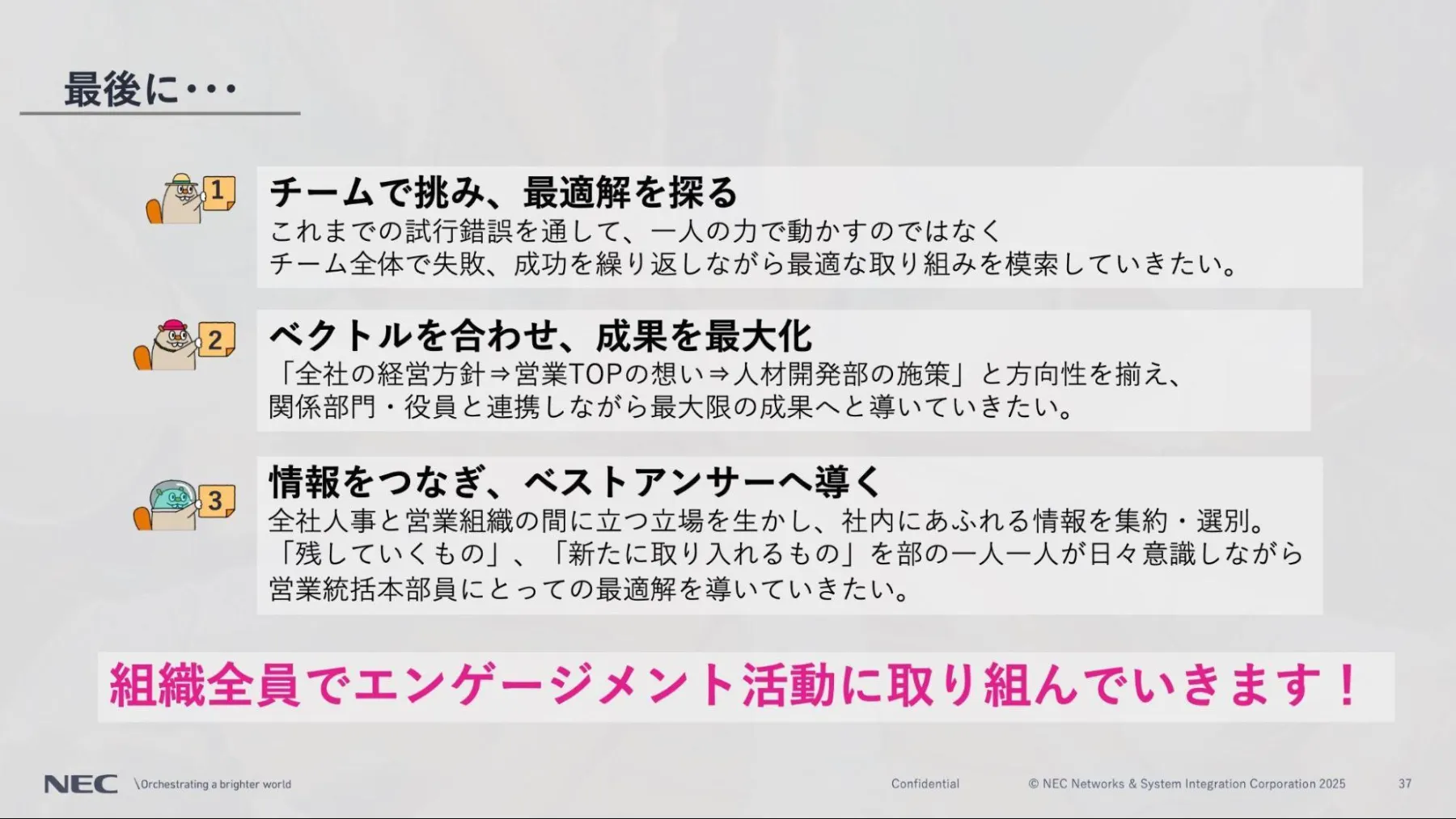 これから私たちが目指す姿です。社員の大半から「推される」存在になること。画一的なルールに縛られることなく、それぞれの立場から組織のビジョンに共感し、主体的な行動へとつなげていく。そして、その行動がやりがいや仲間意識に繋がり、営業組織の文化として定着し、最終的には会社全体、さらにはNECグループ全体へと広がっていくことを目指しています。