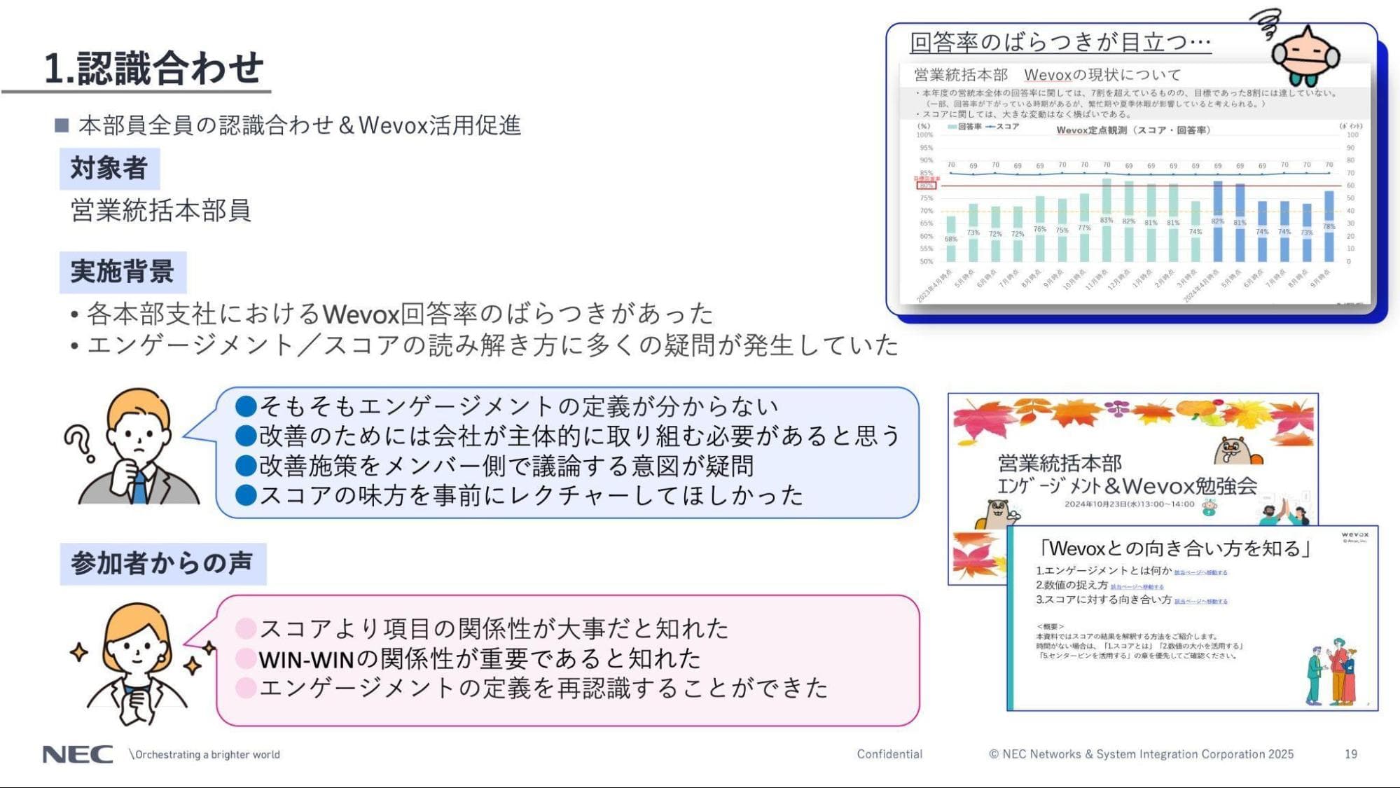 そこで、まずは営業統括本部の全部員を対象とした「エンゲージメント&Wevox勉強会」を企画しました。全社スタッフ部門の人事部(以下、全社人事)や、Wevoxチームの方に講師をお願いし、エンゲージメントとは何か、Wevoxをどう活用するのかといった基礎知識を学び、認識のギャップを埋めることで、本部全体の底上げにつなげました。