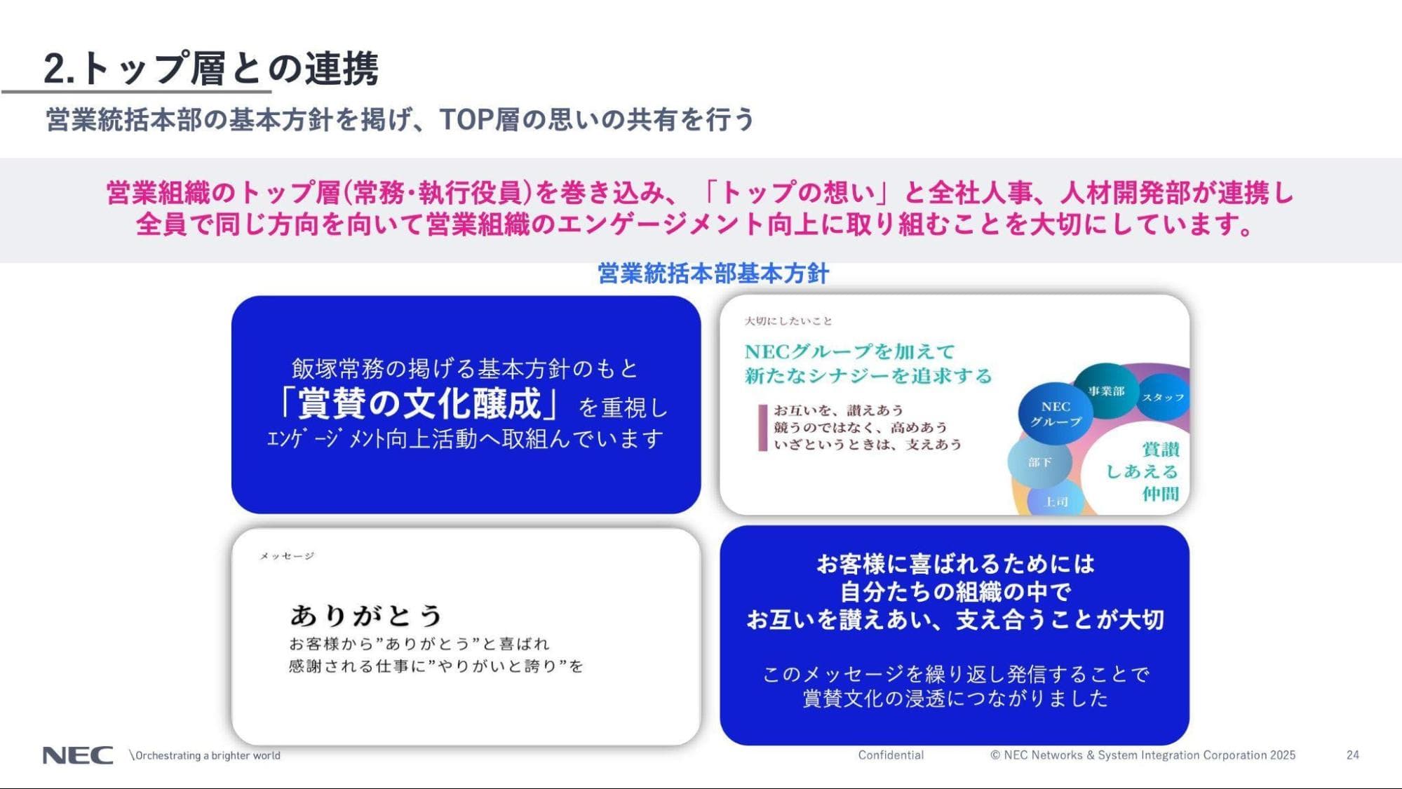 江藤: こうした勉強会と同時に、最も影響力があったのは営業TOP層との連携でした。2023年度より、「お客様から『ありがとう』と言われるこの営業の仕事にやりがいと誇りを持ってほしい。そのためには、まず組織の中でお互いを讃え合い、高め合い、支え合うことが大切だ」というTOPメッセージが繰り返し発信されました。この基本方針が、賞賛文化の醸成に向けた取り組みへとつながっていきました。