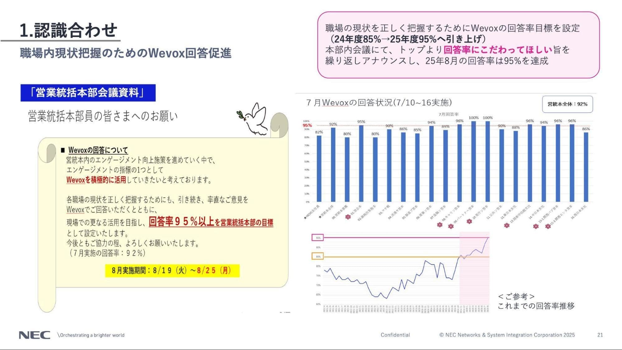 江藤: また、現場の状況を正しく把握するため、Wevoxの回答率にもこだわり、現在は95%を目標に設定しています。営業TOP層からも繰り返しアナウンスしてもらった結果、この高い目標を達成できています。