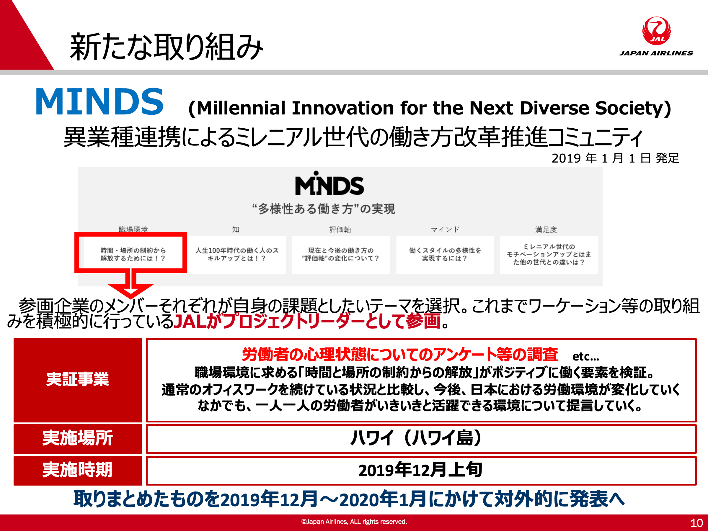 今後の可能性として、企業としては、時間と場所に捉われない柔軟性のある働き方の推進に。個人としては、いつもと異なる環境と経験で自己成長と新たな活力に。そして、社会には地域活性化へ繋がる新たなワークスタイルの提示になればいいなと考えております。みんながWin-winになれる、日本全体の働き方改革に繋がる取り組みにしていきたいですね。 休みの中に仕事を入れるのがワーケーションですが、出張に休暇をつけるブリージャーという制度も最近始めています。アプローチの仕方は違いますが、その土地でしか体験できないことを通じて社員の感性を高める取り組みを進めています。 最後に、私が参加しているプロジェクトを紹介します。自分たちが進めてきた取り組みを、社内だけじゃなく世の中にも広めたいと思い、「MINDS」という異業種連携によるミレニアル世代の働き方改革推進コミュニティに入っております。