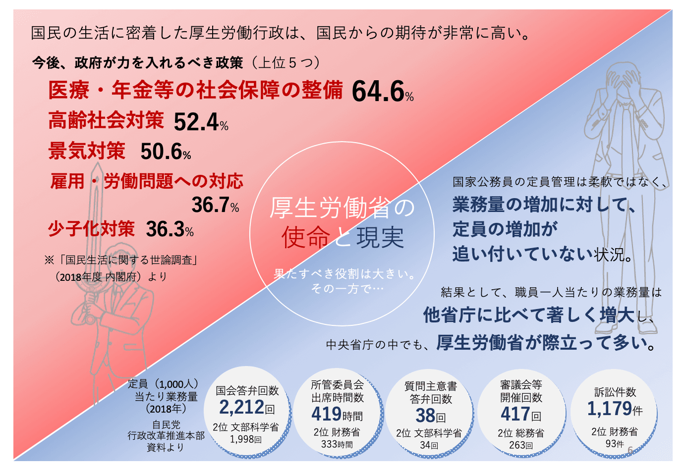 厚労省というのは、医療や年金などの社会保障整備、高齢社会対策、雇用・労働問題への対応から少子化対策など国民の生活に密着した政策に関わる業務が多く、国民の皆様から非常に高い期待を寄せられています。その分業務量は多く、例えば2018年度の「国会答弁回数」や「審議会の開催回数」など、様々な業務量が、他省庁に比べて圧倒的に多いというデータがあります。一方、公務員が多すぎるということで職員数を減らす流れもあり、働き方改革は喫緊の課題となっていました。