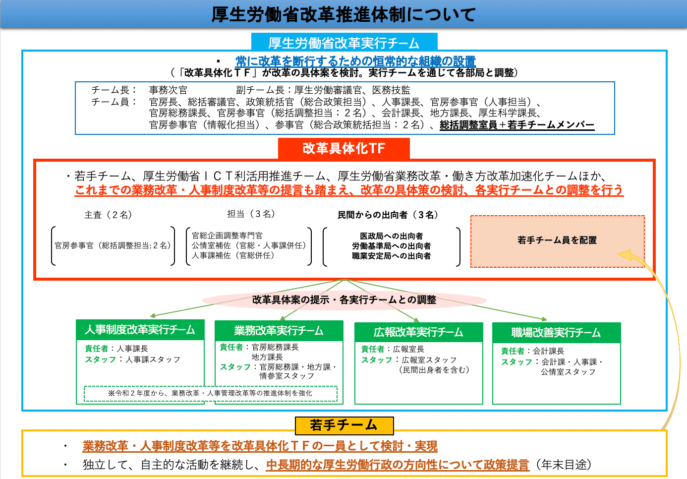 では、最後に、具体的に今、どのような改革が進んでいるのかについても、お話しさせていただきます。厚労省では、我々の提言を踏まえ、事務次官をトップとする「改革実行チーム」という組織ができました。今、若手チームはこの実行チームの改革プロジェクトに参加し、提言を実現していくための改革工程表づくりを進めています。体制としては、この図のような形ですね。