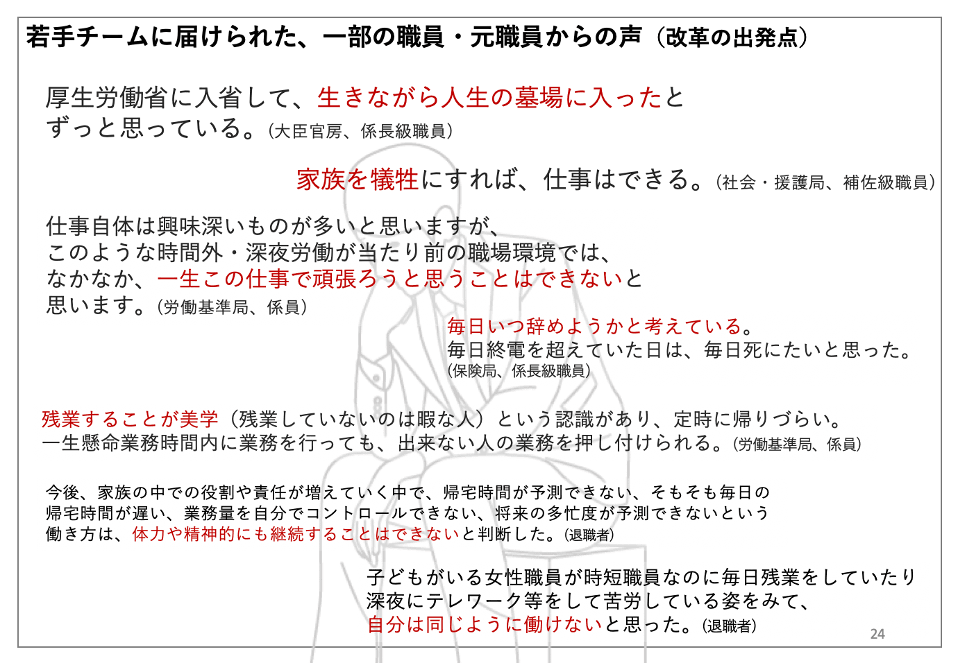 実はこの提言を行う前は、世間のみなさんから「税金をもらっているんだから、こんなこと言ってないでしっかり働け」ともっとお叱りを受けると思っていたのです。でも、予想に反して、好意的な意見を多くいただきました。「厚労省でもこうやって行き詰まっているんだ。同じような悩みを抱えているんだ。自分たちも頑張っていこう」といった、前向きな声をSNSなどでいただいたんです。 今日、まずは、そもそもなぜ今回の提言を行ったのか、その背景を説明したいと思います。