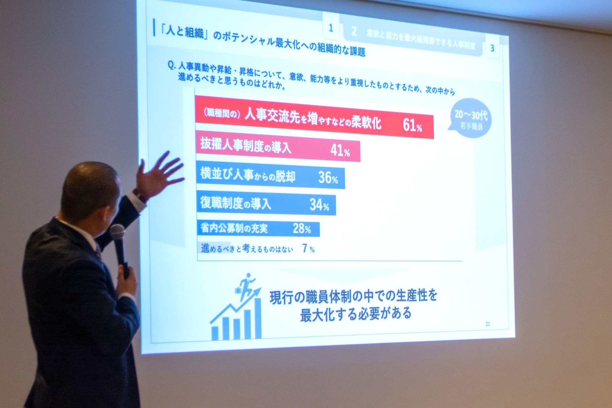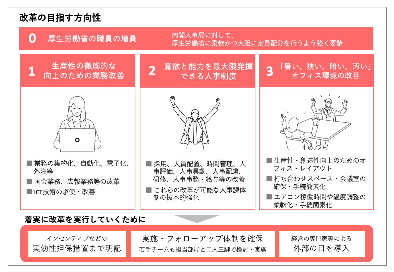 まずは前提として、職員数を増やすというのは政府全体の議論になるので、我々ができる範囲で最善を尽くそうという考えがベースになります。そのうえで、「1.生産性の徹底的な向上のための業務改善」「2.意欲と能力を最大限発揮できる人事制度」「3.『暑い、狭い、暗い、汚い』オフィス環境の改善」の3つを柱に進めていくことを決めました。