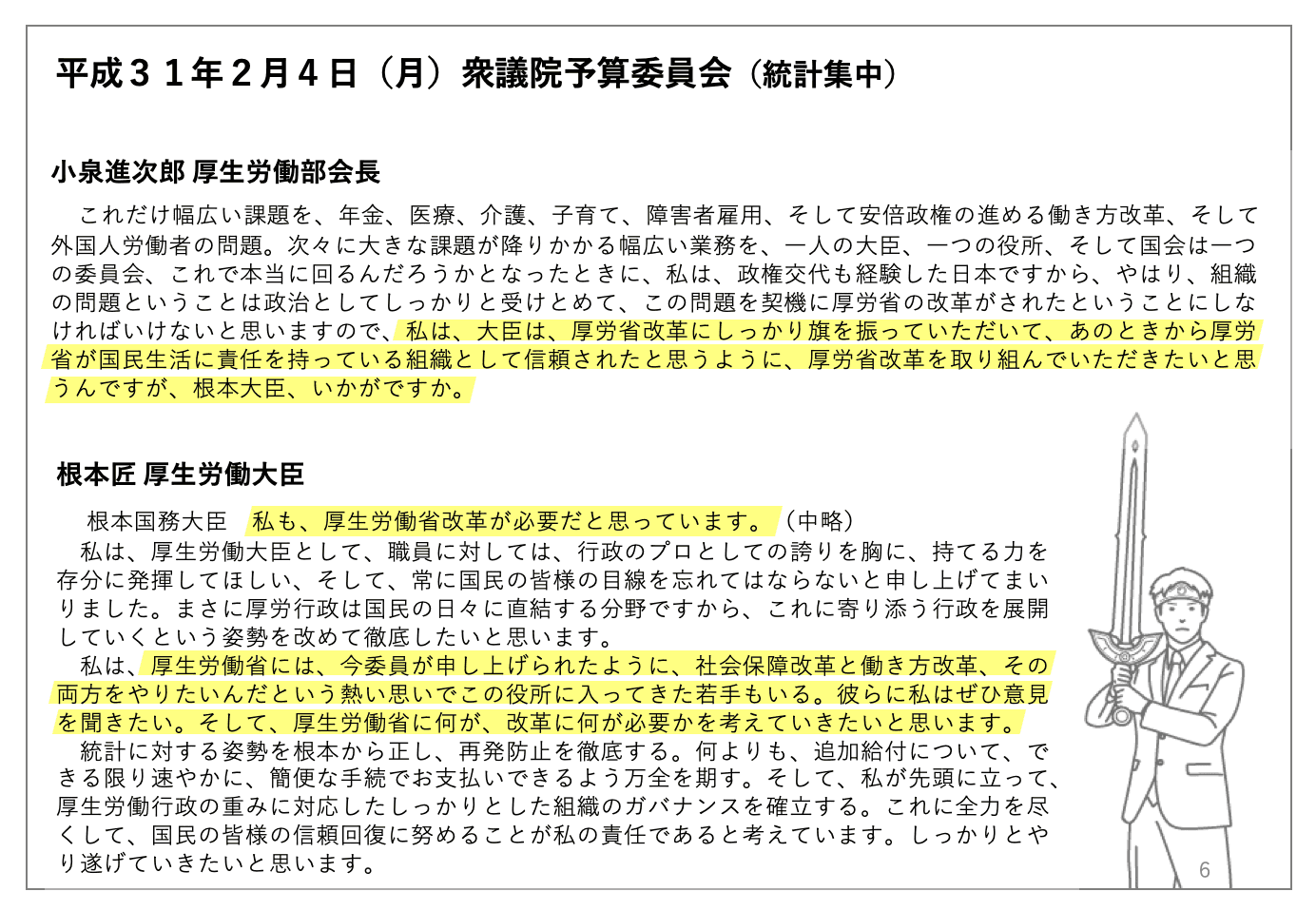 こうした状態を脱却し、職員一人ひとりが活き活きと働いて、国民の期待に応えられるようにしなければいけない。こうした話が盛り上がってきたときに、小泉進次郎先生が発端となって具体的に動き出すことになります。小泉先生に、平成31年2月4日の衆議院予算委員会で厚労省の組織改革の必要性について言及していただき、それに応える形で当時の厚生労働大臣だった根本匠先生に「若手の意見を聴いて、厚生労働省改革をしたいと思います」と答弁していただいたのです。これらの発言が、若手チームの結成と提言に繋がっていきました。