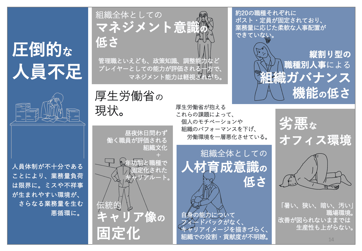 これではダメだと、まずは若手の退職者14人にヒアリングを行い、退職理由を話してもらいました。他にも、他省庁や、外部企業、大学教授の声も取り入れながら、徹底的に改革すべき点を洗い出したのです。 その結果、見えてきた厚労省の現状が以下の図になります。