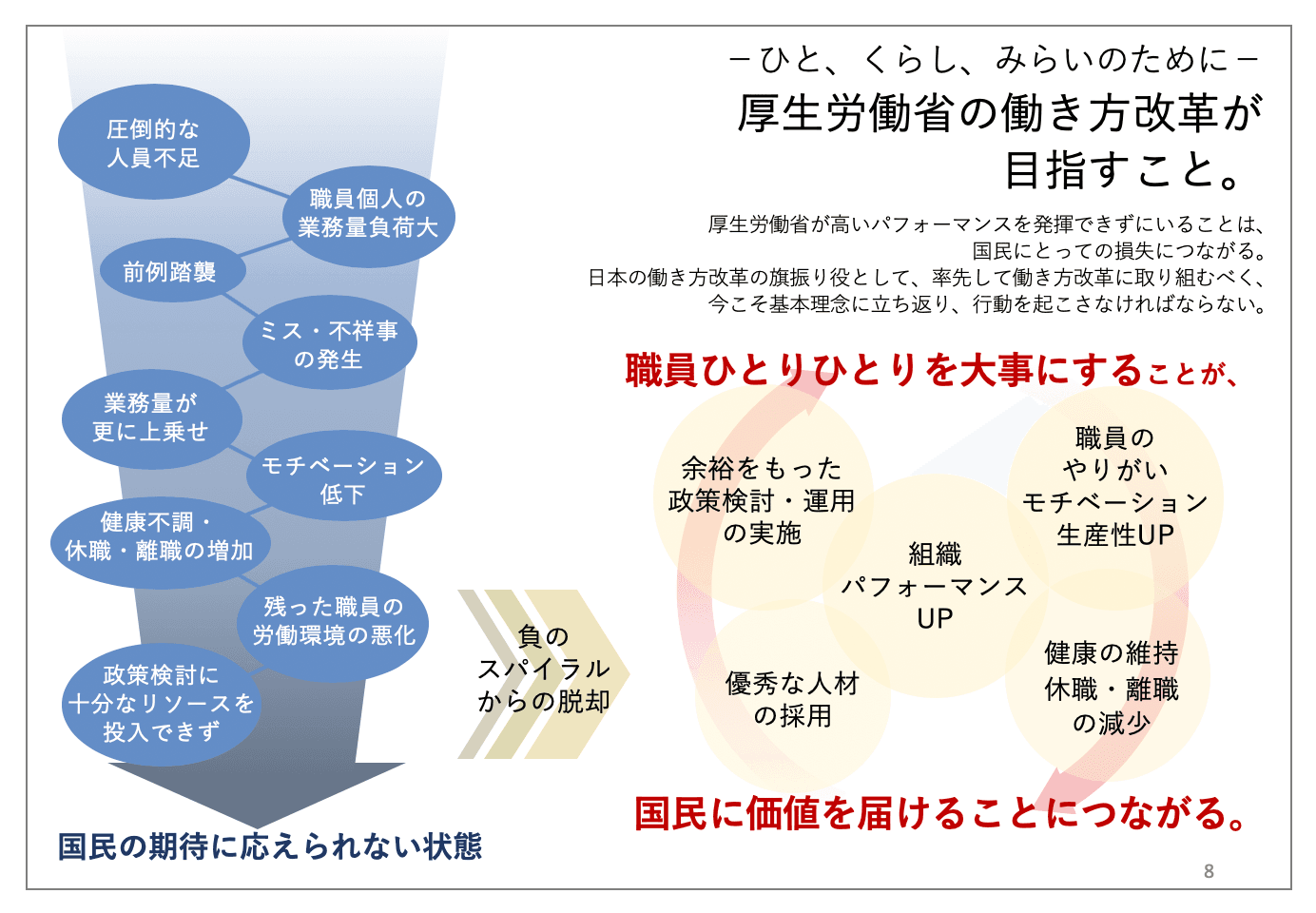 不祥事対応で業務がさらに増え、モチベーションの低下や健康不調、離職の増加など負のスパイラルに陥っています。残った職員の労働環境は悪化の一途で、政策検討に十分なリソースも割けず、このままでは国民の期待に応えられない状態になってしまっています。
