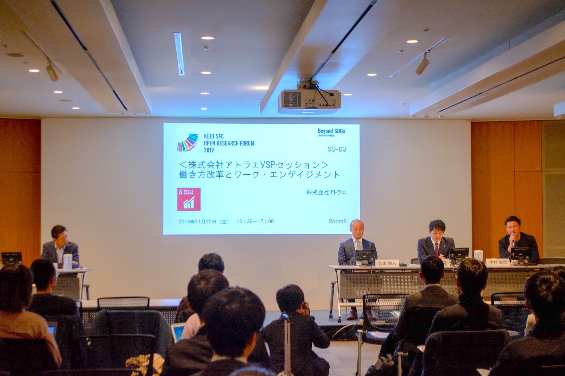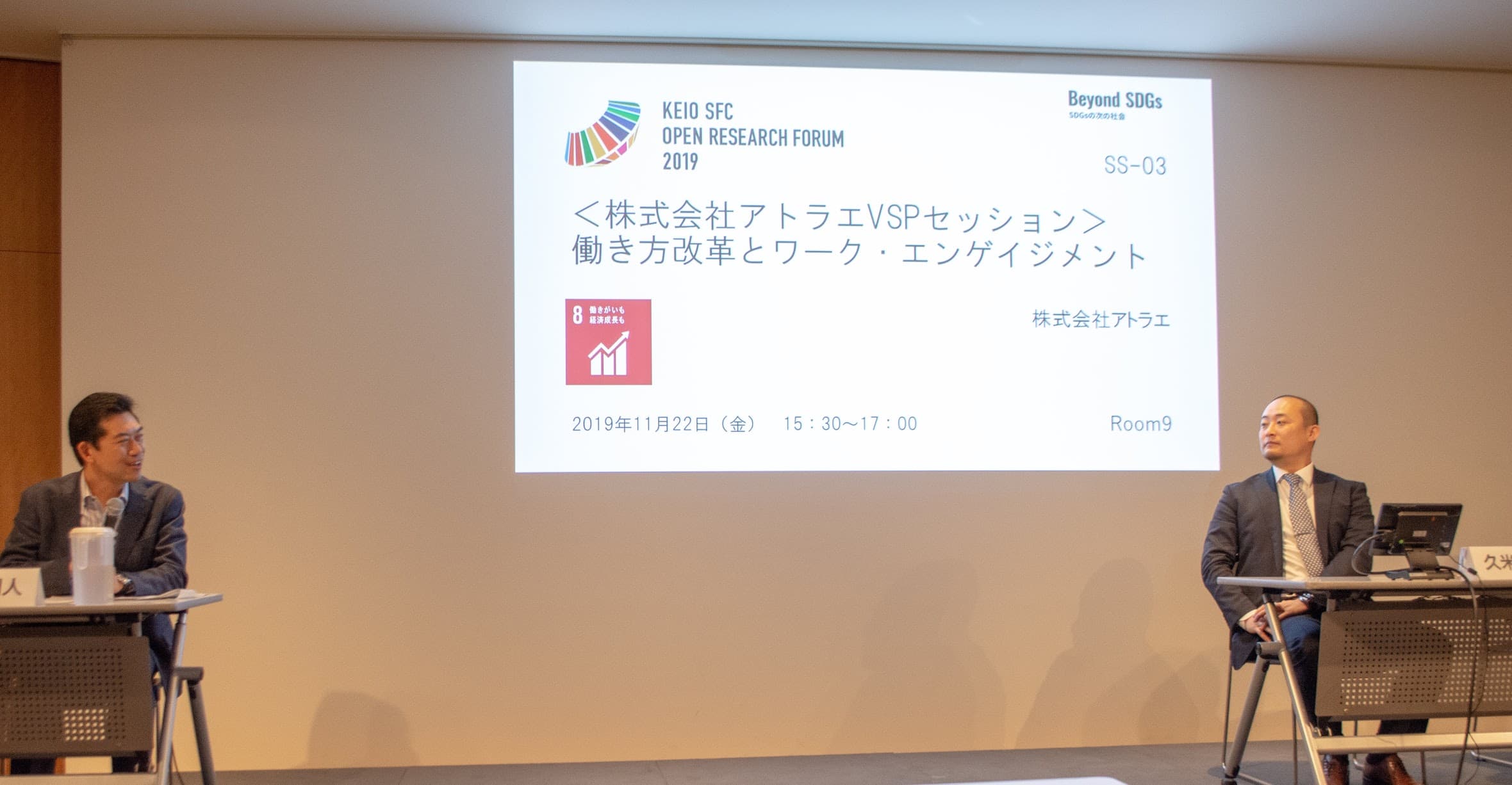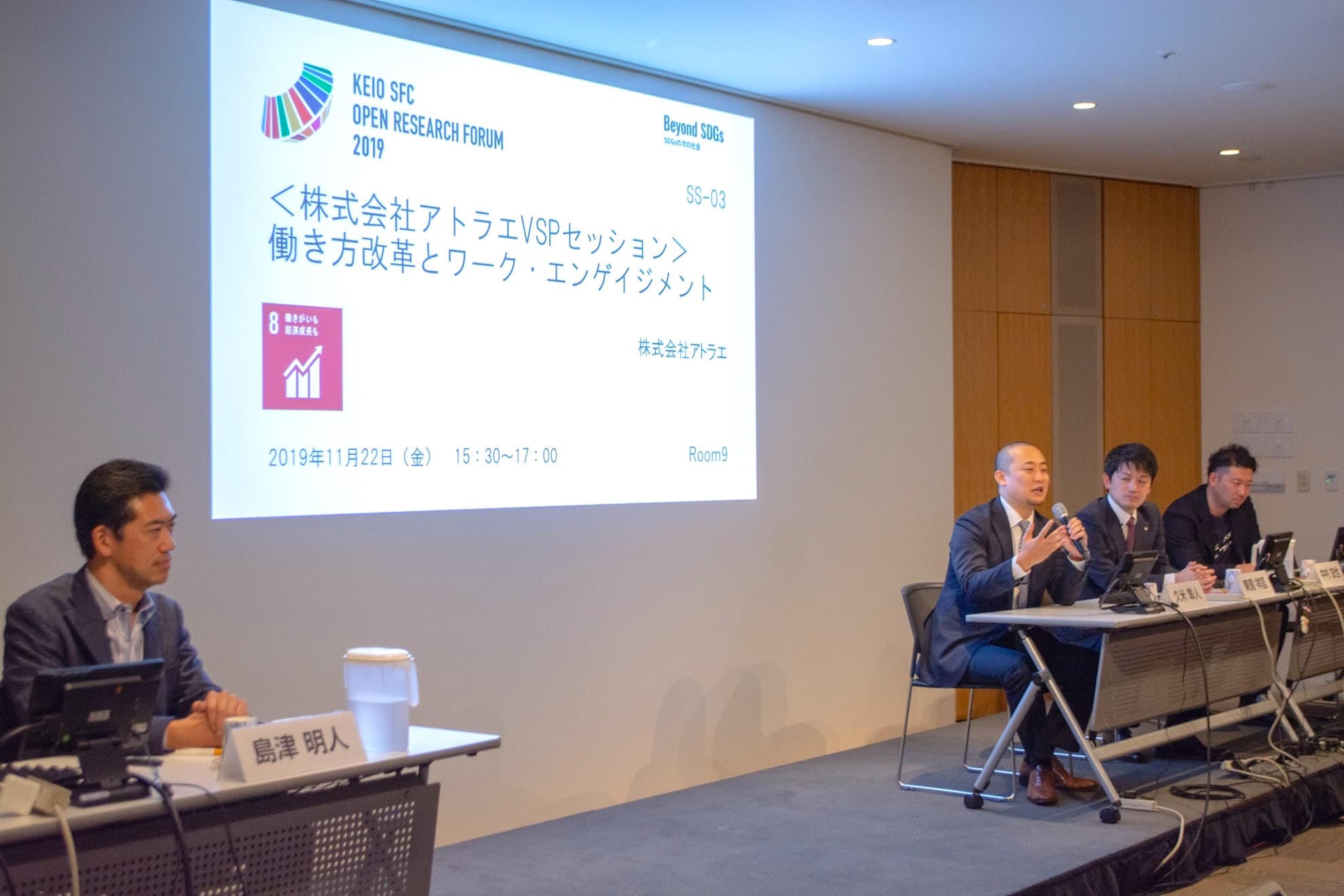 11月22日(金)、東京ミッドタウンタワーで【第24回慶應義塾大学 SFC Open Research Forum 2019「働き方改革とワーク・エンゲイジメント」セッション】が行なわれました。今の時代は働き方改革が進み、多様な人材の活用、柔軟な働き方が求められています。どうすれば働く人々が健康で活き活きと働けるか、「ワーク・エンゲージメント」をキーワードに研究者、省庁職員、大企業やベンチャー企業の社員など、様々な領域の実践者でトークセッションを行ないました。トークセッションレポートの最終回では、前回までワーク・エンゲージメントや働き方についてプレゼンをした3人に、アトラエの中村友也さんを加えた4人でのセッションをお届けします!