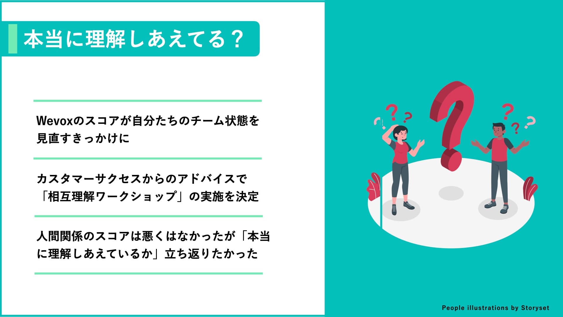 平川:エンゲージメントをどう向上していくかを、Wevoxカスタマーサクセスの方に教えてもらう中で印象的だったのが、第一段階として「相互理解」が必要で、それをベースに「課題解決」へと向かう方法が有効だという話でした。