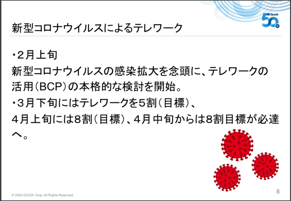 そして今回の新型コロナウイルス。各社でいろんな対応をされてきたかと思いますが、我々もルールや制度を見直して、それまでの2,3割のテレワーク利用からの拡大を図りました。検討を開始し、2月から段階的にテレワークの数が増えていきました。