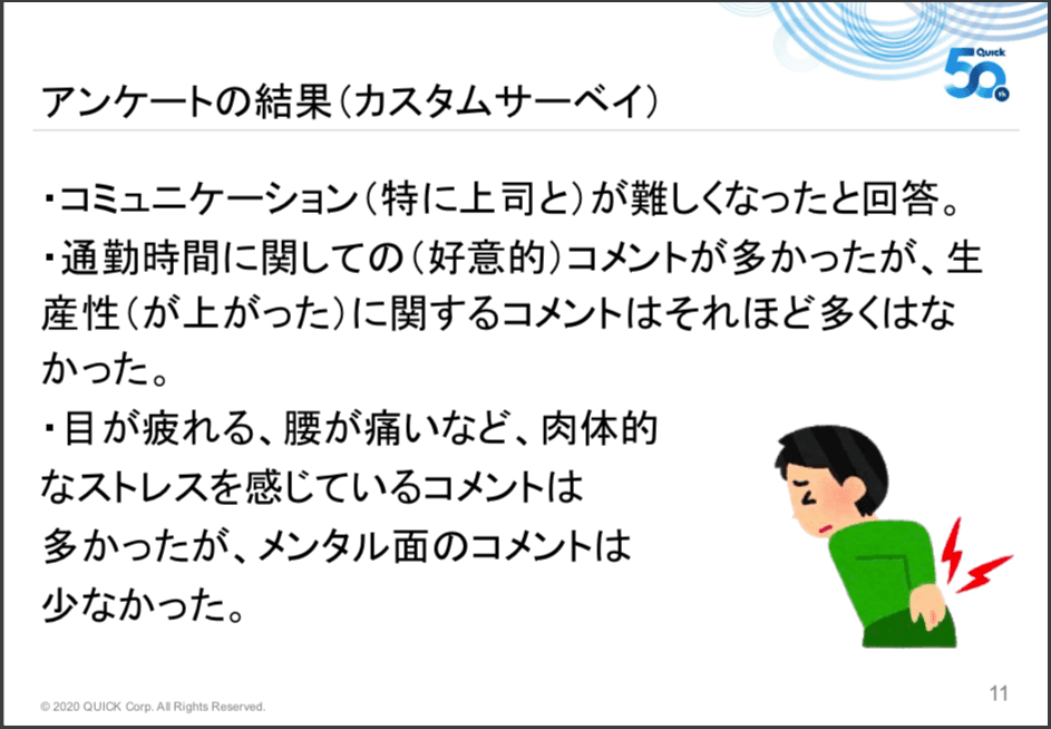 生産性に関しては、コメントがそれほど多く出てきませんでした。あとは目が疲れる、腰が痛いといった肉体的なストレスに言及している人が多かったです。通勤時間がなくなったが、自宅で仕事する環境が整っていないということですね。あと、意外とメンタル面のコメントが少なかったという印象でした。