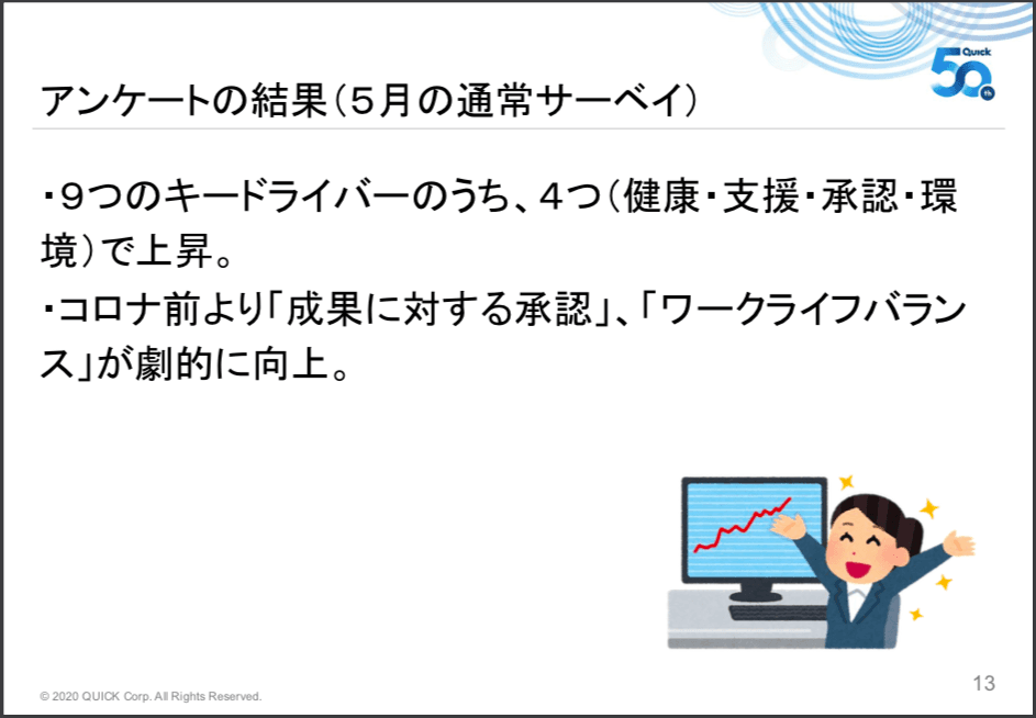 5月の通常のエンゲージメントサーベイも基本的には上昇の傾向にありました。健康、支援、承認、環境の4つのキードライバーが上がって、他はほぼ現状維持。コロナ前でと比べて大きく変わったのが「成果に対する承認」と「ワークライフバランス」です。