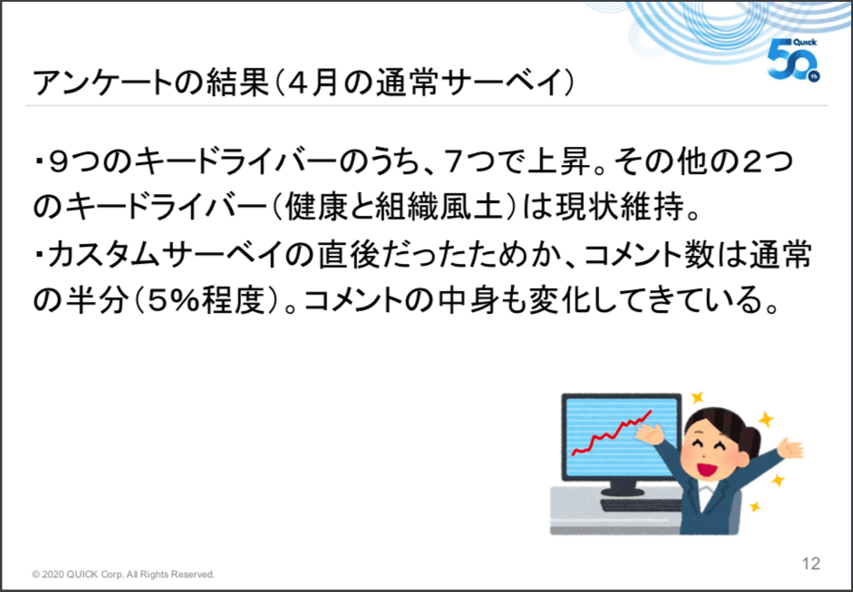 並行して通常のエンゲージメントサーベイも行いましたので、4月のエンゲージメントサーベイ結果をシェアします。正直、強制的にテレワークになって、かなりエンゲージメントが落ち込むと思っていました。しかし、9つのキードライバーのうち7つが上昇という結果になりました。